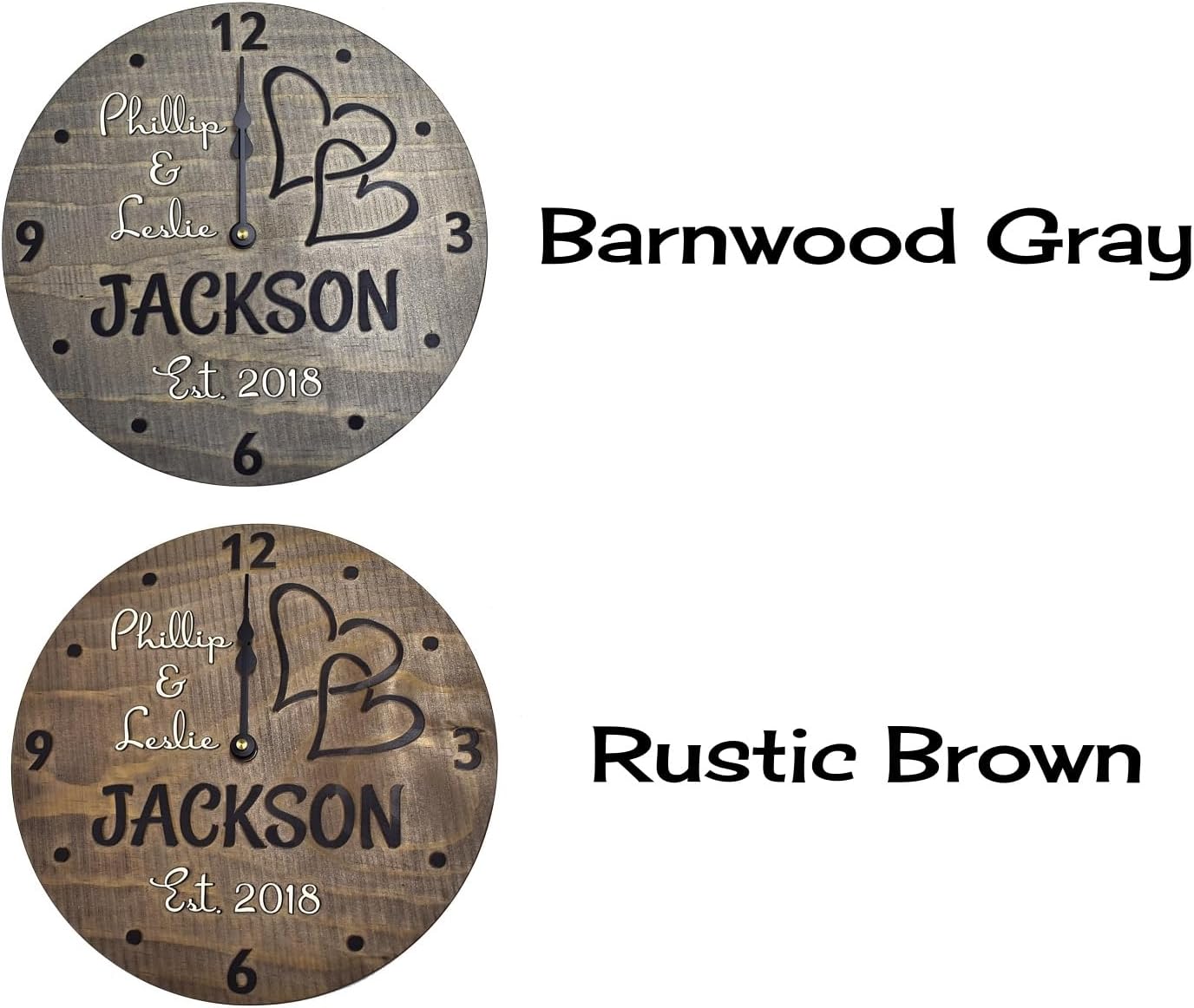 11 inch diameter personalized wooden clock, custom made just for you. Features interlocking hearts in addition to the couple's first names, last name, and wedding date (or established year only if preferred). Precision carved from solid wood (3/4 inch thick) so that the features are raised from the rustic background. Hand stained on all sides in a charming barnwood grey or rustic brown color. Great gift for a wedding, anniversary, bridal shower, engagement, housewarming, or other special occasion. Please feel welcome to message me if you have any questions about ordering your clock.