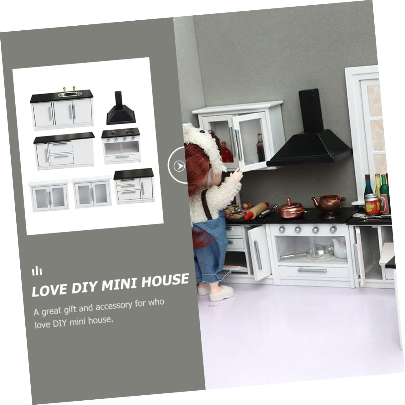 Package Include 1 x Mimi Cooking Bench 1 x Mimi Mimi Long Plane Table 1 x Mimi Short Plane Table 2 x Mini Hanging Cabinets 1 Ventilator Characteristics - Color: Black - Kitchen Ventilator Size: About 7x4.5x6.2cm/2.76x1.77x2.44in -Product Info:Wooden mini furniture - Material: Wood - Cooking Bench Size: About 8.9x3x6.3cm/3.5x1.18x2.48in - Hanging Cabinet Size: About 8.9x3x6.3cm/3.5x1.18x2.48in - Long Plane Table Size: About 12.7x5x6.1cm/5x1.97x2.4in - Water Channel Size: About 12.4x5x6.1cm/4.88x1.97x2.4in - Short Plane Table Size: About 8.4x5x6.1cm/3.3x1.97x2.4in - Fine craftsmanship and details ensure its practicality and popularity Miniature Kitchen Model. - An important mini house accessory and makes your mini house more attractive and real Mini Wooden Furniture. - Great for adding life atmosphere for your mini house, chic and lovely Doll House Kitchenette. - This mini house decorative furniture is made of great resin material which is durable. - It can be used as a photography prop, mini house decoration accessory Mini House Furniture.Goods InformationWooden Mini Furniture These products are mini house furniture model decor for decorating or playing, suitable for house decor and handmade items' decor.Mini House Kitchen It's made of wood material, they are mini house collection decorations