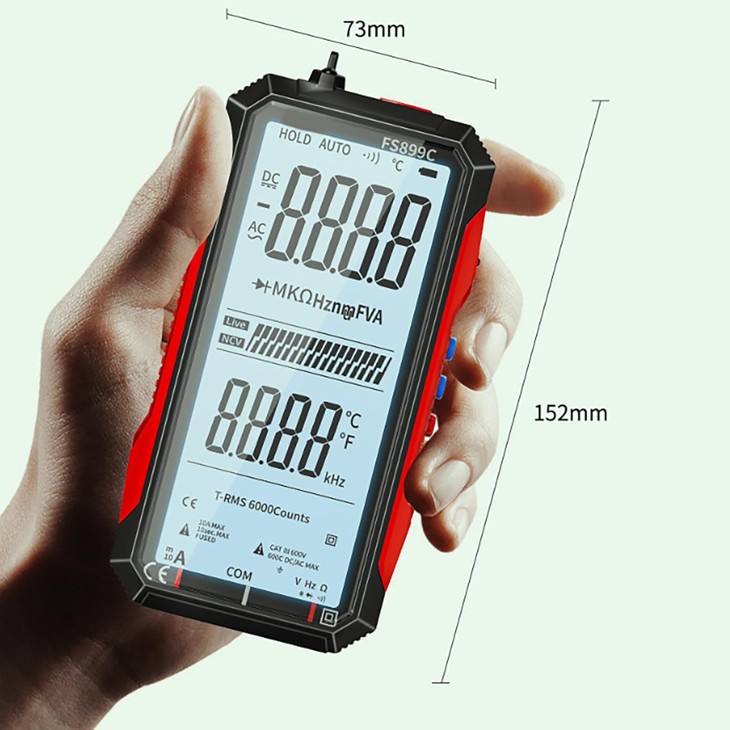 FAQ: Q: Can it measure capacitance? A: Yes, it supports multiple capacitance measurement ranges to suit different testing needs. Q: Does the product come with a carrying case? A: Yes. Q: Does it have an auto-ranging function? A: It supports auto-ranging, eliminating the need for manual switching and increasing convenience. Q: Does it have an auto-off function? A: Yes, it will automatically shut down after a period of inactivity, extending battery life. Q: Can it measure temperature? A: Yes, it has a built-in temperature measurement function. Q: What is the lowest voltage it can detect? A: Generally, it can detect approximately 60mV. Specification: Name: Digital Multimeter Material: Plastic, Metal Size: Standard Product Includes: 1 Pc * Digital Multimeter 2 PCS * Test Leads 1 PC * Instruction Manual 1 PC * Charging Cable 1 PC * Packaging Box Note: 1. Please allow slight differences due to manual measurement. 2. Due to the different display and different light, the picture may not show the actual color of the item. Thanks for your understanding.