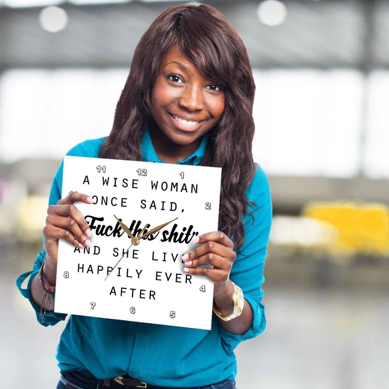 A wise woman once said Fuck this shit and she lived happily ever after wall clock is a wonderful complement to any room in your home or office. Made of durable high grade aluminum. This frameless clock has a high gloss mirror like, UV coated, scratch resistant finish and is suitable for a moist environment. Sizes available range from 10" x 10" to 15" x 15". requires one AA battery; not included. Battery box is not covered. Made in USA.
