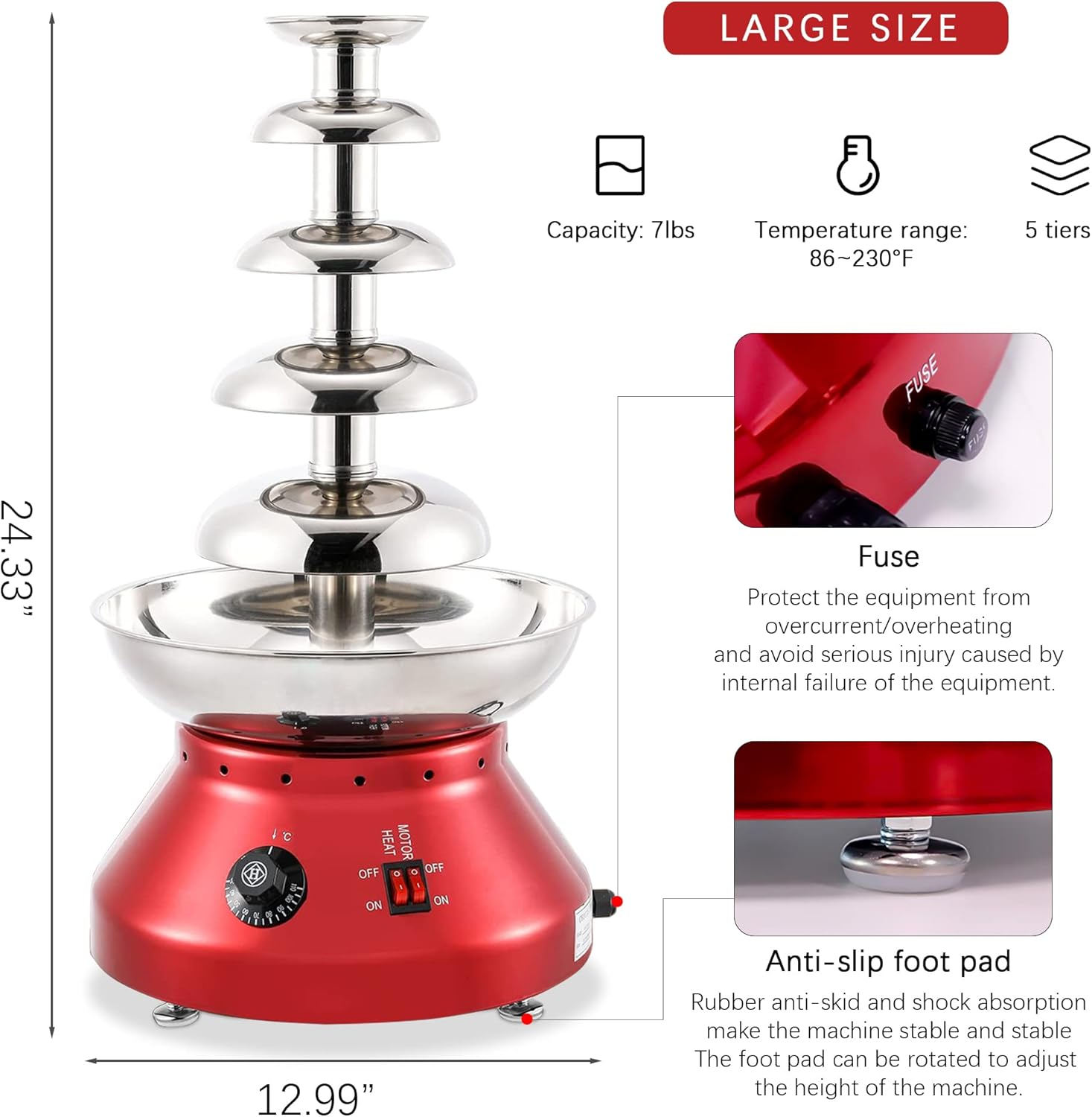 Features: 1. The 5-layer chocolate waterfall fountain machine is made of food-grade stainless steel, which has the characteristics of high strength, durability, strong corrosion resistance, and good shock resistance. 2. 230W high power, stronger machine working ability and greater power. 3. The temperature can be adjusted within a range of 30°~110° to rapidly heat up. 4. The pure copper motor has good performance, more durability and long service life. 5. Bottom and edge porous heat dissipation design improves heat dissipation function and prolongs machine life. 6. Detachable tower design, easy to clean. 7. The running noise is low, the bottom rubber protective shock-absorbing foot pad improves the stability of the machine, and the rotatable foot pad adjusts the height of the machine. Specifications: Material: food grade stainless steel Voltage: 110V/220V , English manual Rated frequency: 50HZ/60HZ Rated power: 230W Temperature adjustment: 30°~110° Capacity: 3000ml Number of tower layers: 5 layers Product size: 330 330 613mm Packing size: 515 365 520mm Net weight: 6.1kg Gross weight: 8kg