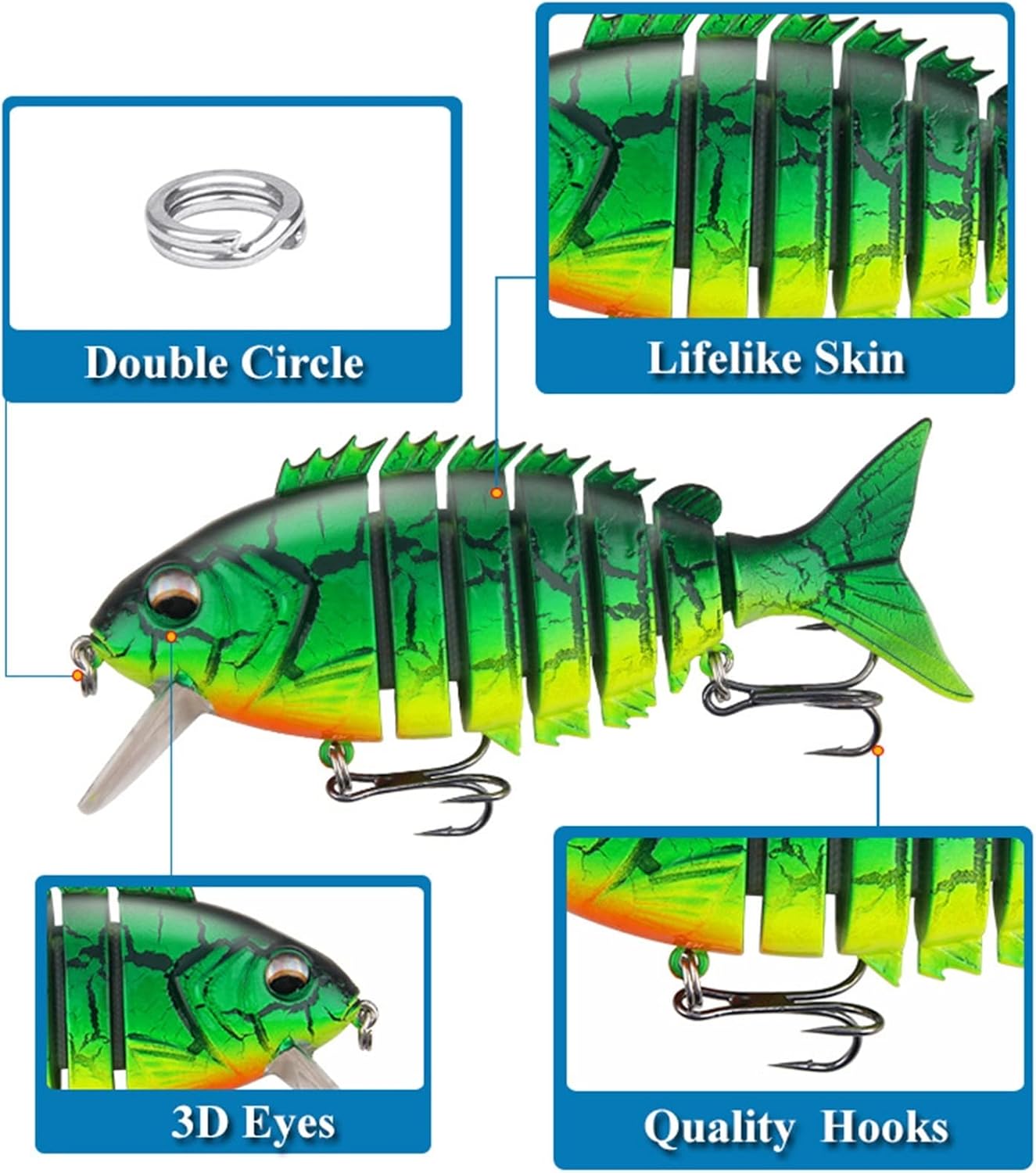 They create life-like swimming actions in water!Bright colors, to attract big fish!3D eyes make it a powerful catching tool!Size: 10cm 22gDiving Depth: SinkingQuality hooks: 2x Strong Treble HooksColors: Multiple colourTarget Fish: Pale chub,bass,Pikes,Yellowcheck carp,Chinese perch,Topmouth culter