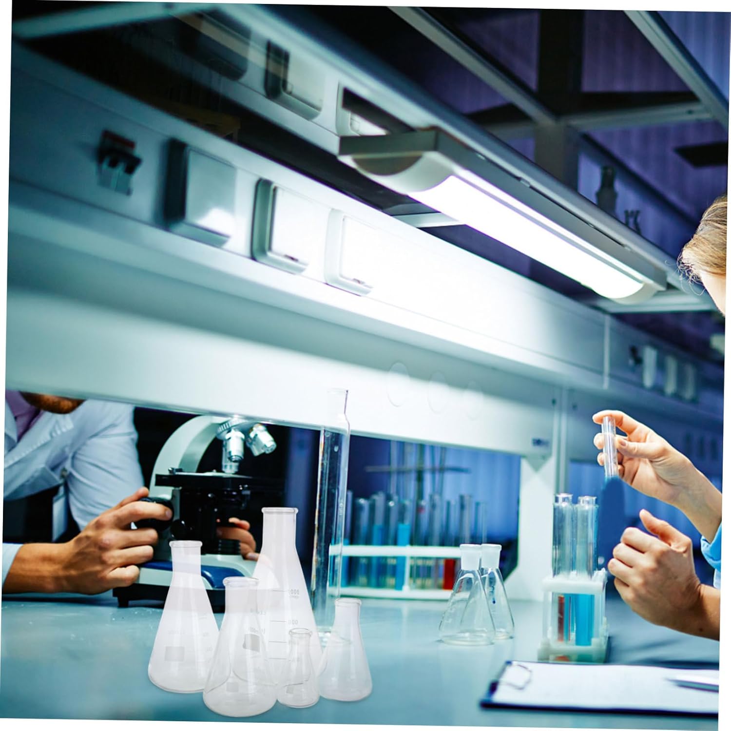 Package List 5 Flasks ( 50ml+150ml+250ml+500ml+1L ) Features -Easy to clean: the welldesigned mouth of the flask makes it easy to clean and fill, ensuring convenience and efficiency in the lab glass beakers -Material:High borosilicate lab beakers -Heat resistant: this erlenmeyer flask is made from high borosilicate glass, which is resistant to high temperatures, making it ideal for laboratory use chemistry glass flasks -Color:Multi science flask -Adequate capacity: the flask's capacity is suitable for a wide range of laboratory tasks, providing enough space for mixing and measuring liquids graduated conical flask -Size:18.00X10.50X10.50cm/7.07X4.13X4.13in borosilicate glass flask -Efficient design: the conical shape of the flask allows for easy and controlled pouring of liquids, reducing the risk of spills and splashes science beakers glass -Product Info:Experimental conical bottle -Stable structure: the triangular base provides excellent stability, preventing the flask from tipping over and ensuring safety during experiments conical flask bottleGoods Informationgraduated conical flasks The high borosilicate glass Erlenmeyer flask is a versatile tool in any chemistry lab.erlenmeyer shape flasks Its ability to withstand high temperatures makes it suitable for heating and boiling various chemical solutions.glass flask It is an essential piece of glassware for conducting experiments, storing reagents, and performing titrations.conical flask The flask's conical design allows for efficient mixing and swirling of liquids, reducing the risk of spills