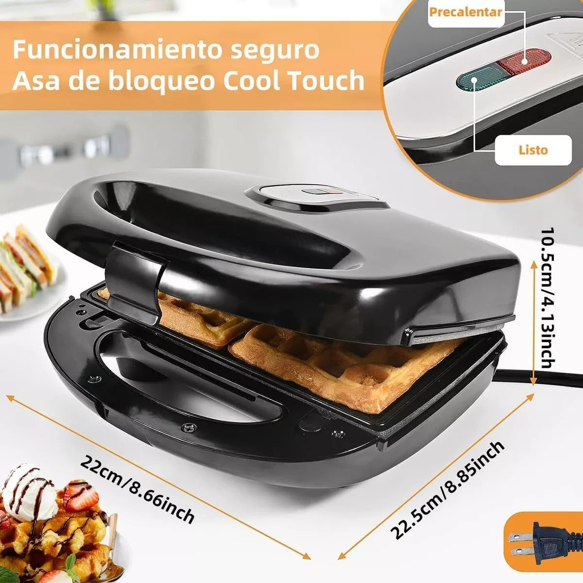 Features: 6 sets of plates including sandwich plates, donut plates, waffle plates, grill plates, walnut cake plates, madeleine plates. Double-sided heating design allows you to enjoy delicious food more quickly. Non-stick coating prevents food from sticking and makes cleaning a breeze. The handle stays cool to the touch during operation, providing a safe and secure grip. Easy to use, suitable for both beginners and seasoned chefs alike. Specification: Item name: Waffle Maker Plug type: US Plug Voltage: 110V Power: 750W Color: Black Material: ABS + Stainless steel Package Includes: 1 * Main body 6 * Sets of baking plates