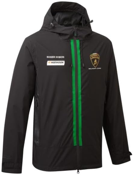 The Lamborghini Squadra Corse team lightweight jacket is weather resistant, breathable and flexible, perfect for those on the move. Features a peaked hood, two rubberized front zipped hand pockets, waterproof zips, 3D zip pull, Velcro fastening cuffs, interior printed lining, Automobili Lamborghini to the right sleeve and an internal zipped chest pocket. The jacket details the double viper green stripes, exclusive hexagon pattern inspired collar, team and sponsor logos logo to the front and back, finished with the Italian flag stripes embroidered to the back.