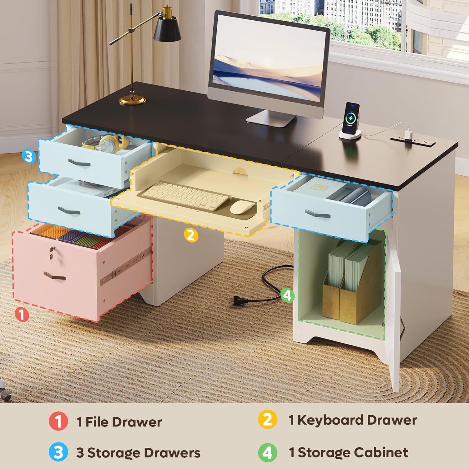 • Robust & Durable: Built with sturdy dual pedestals, the desk supports up to 200 lbs on top, 20 lbs in each drawer, and 40 lbs in the file drawer—ideal for monitors, printers, and more