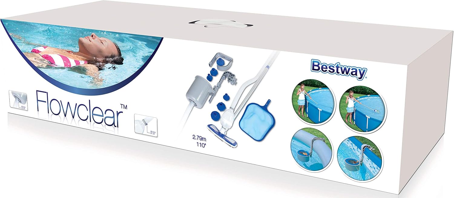 Durable and corrosion-proof plastic material Includes 2.79m / 110” adjustable aluminum pole for large diameter pools Removable and reusable debris and leaf bag Compatible with filter pumps with flow rates of 2,006 L/h (530 gal./h) and above Attach to the filter pump for skimming and vacuuming Compatible with above ground pools up to 20 ft. (6.10 m) in diameter Extra-long vacuum hose 7.50 m / 24.5’, 3.2 cm / 1.25” diameter Multi-functional - Pool surface skimmer: working with the filter pump cleans floating leaves and other debris - Pool vacuum: working with the filter pump cleans pool walls and floor - Pool skimmer: manually clean floating debris Contents: Pole with skimmer, surface skimmer and vacuum