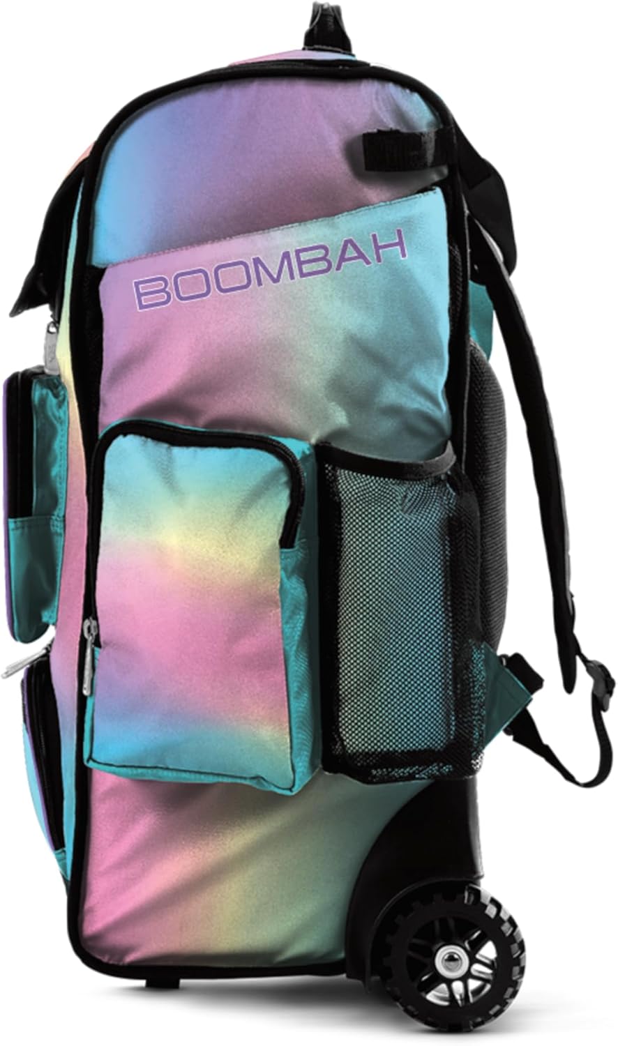 Boombah Ultrapack Hybrid Rolling Bat Bag - Wheeled & Backpack Version - Softball Dream The Ultrapack Hybrid Rolling Bat Bag is a high-capacity baseball and softball equipment bag built for serious players who need one bag that can handle everything. With room for catcher's gear, bats, cleats, and more, this large bat bag is the go-to for programs that demand organization and durability.Ideal for competitive athletes, team travel, and consistent use. One bag that's big enough for every position, including catchers.It features a hybrid carry system with rugged wheels and adjustable backpack straps, so you can roll it or wear it depending on the day. The reinforced base keeps the bag upright and stable, while the durable polyester shell stands up to long seasons of travel and heavy gear. This wheeled bag includes two reinforced, fully-lined bat sleeves, one on each side. Each sleeve can hold up to two bats or one bat and one shin guard. Water bottle pockets on each side provide even more storage flexibility. The ventilated shoe compartment and mesh organizers help keep everything separated and ready to go. Whether you're gearing up for tournaments or organizing the dugout, the Ultrapack Hybrid brings smart storage and serious flexibility to your season.Available here in Softball Dream, this vibrant design blends pastel pinks, purples, and blues for a dreamy gradient look. Bright. Playful. Unforgettable.Please tuck the backpack straps into their pocket when rolling the bag to prevent damage.About Boombah:Boombah baseball and softball products are part of our huge family of sporting gear, apparel and accessories. We design and manufacturer our own line of high quality sports equipment and gear for the sports you love.