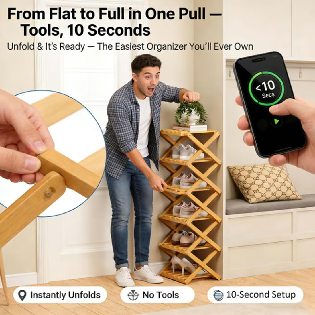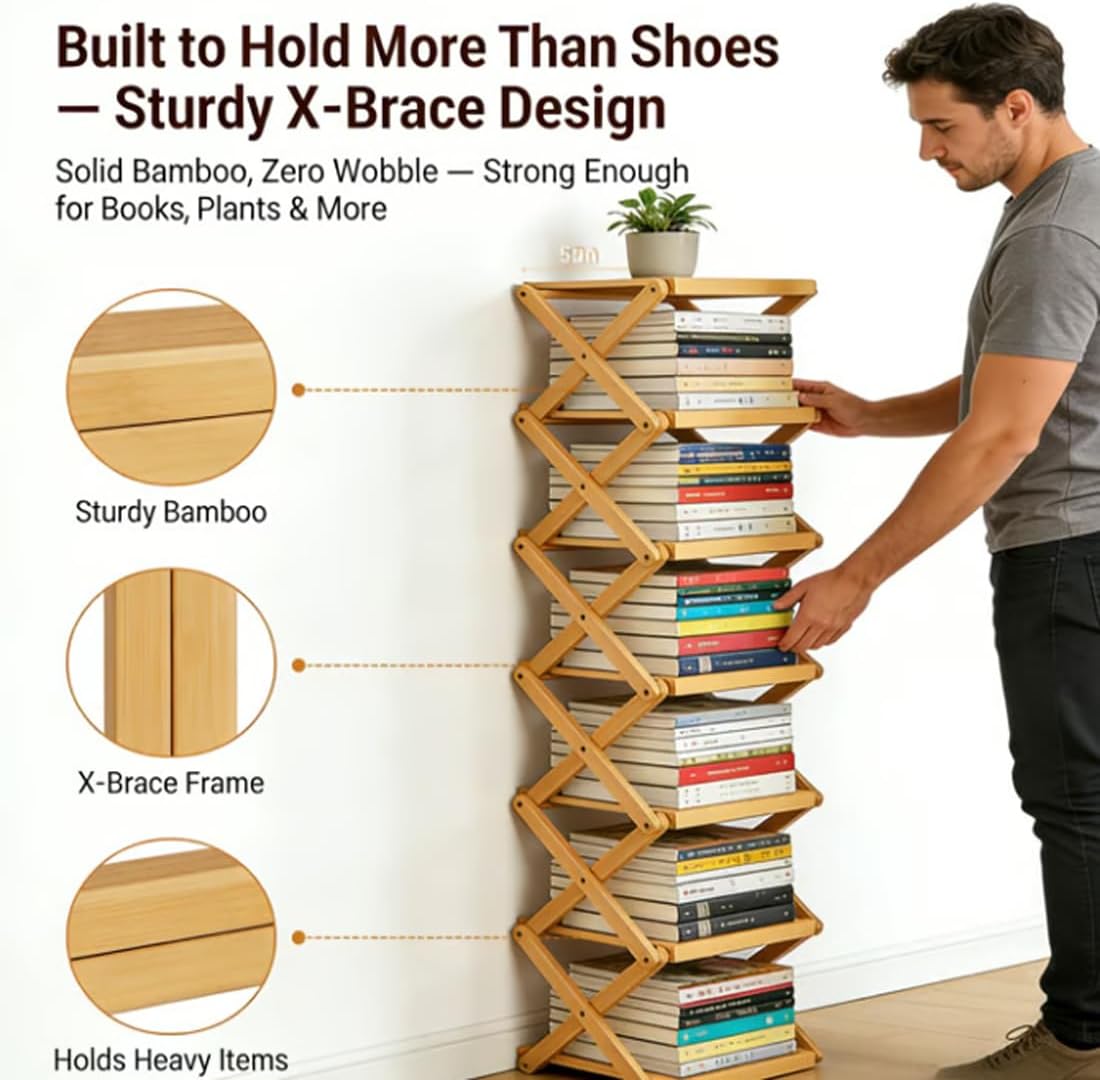 Features: No assembly required – Ready to use right out of the box Thick and durable material easily supports over 40 pounds Vertical design saves space, perfect for dorm rooms, corners, and other compact areas Wider and taller design accommodates various shoe types and larger sizes Multi-purpose – Stores shoes, books, folders, small potted plants, etc. Specifications: Type: Folding shoe rack Material: Bamboo Installation Requirements: No installation required Pack Includes: 1 * Foldable Bamboo Shoe Rack