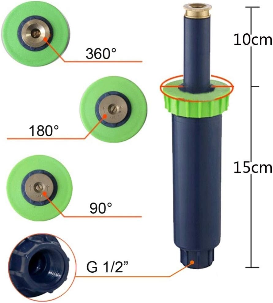 Easy to use-connect the water connector to the connectorName: Popup SprinklerSpray radius: 3-4.5m Spray diameter: 6-9m Connect size: 1/2 inch female thread Work pressure: 1.5-3KgFlow rate: 0.5-1.2 m³/HSpecification:90°,180°,360°Features: 1. Made of high quality ABS plastic, spray head is copper2. 90°,180°,360° spray, covering large range, water droplets evenly3. Spray head is adjustable, extend height is about 5 cm4. Spray head is easy to install, and very convenient to clear pipe5. High elasticity spring, it can avoid leak effectively when water pressure is low. 6. Spray edge is clear, reduce wasting water and leak water.Inside filter mesh design, avoid spray head blocked. The inside spring is stainless steel, will not get rusty.Packaging: 5 PcsNoteIt is manual measurement, there may be 1-2mm error.Due to the difference between different monitors, the picture may not reflect the actual color of the item. Thank you!
