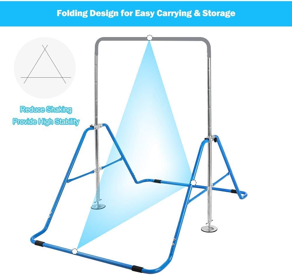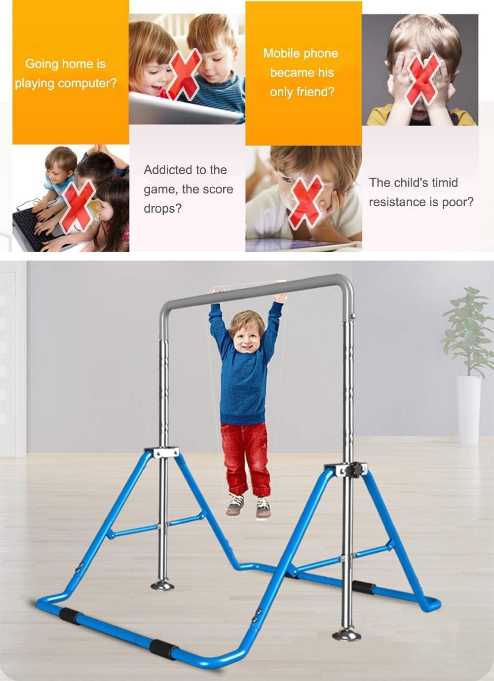Our adjustable gym bar is made with your gymnast in mind.?Safe, secure and long lasting that allows you to practice gymnastics at home.?We are proud to create quality gymnastic products.?The junior gymnastics training bar is perfect for the gymnast for beginners from 3 to 12 years old.? So bring this gift to your child, give your child the fantastic training equipment they have always dreamed of, let giggles and excitement fill your home.Please believe us, you will amaze your children and their friends, will enjoy endless fun and active reproduction Specification: Color: blue Material: steel Capacity: 200 kg Dimensions: 101x145x84 ~ 137 cm