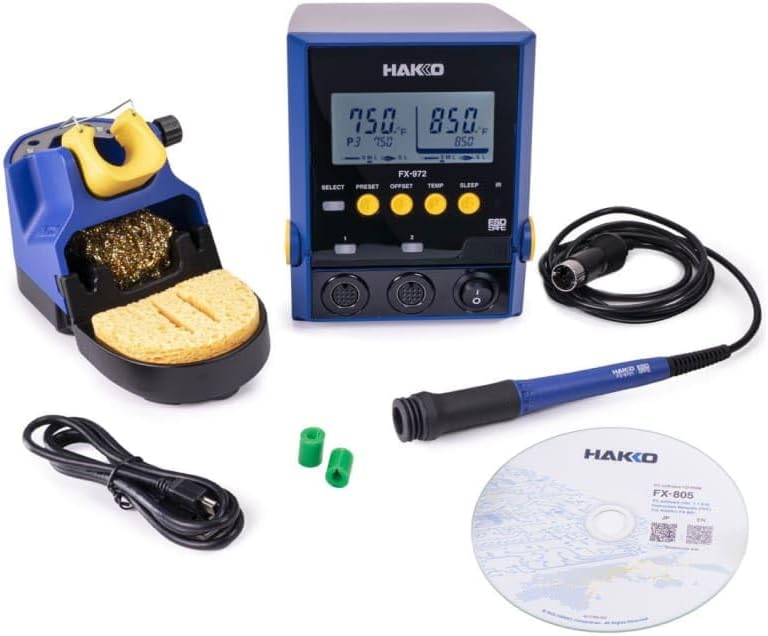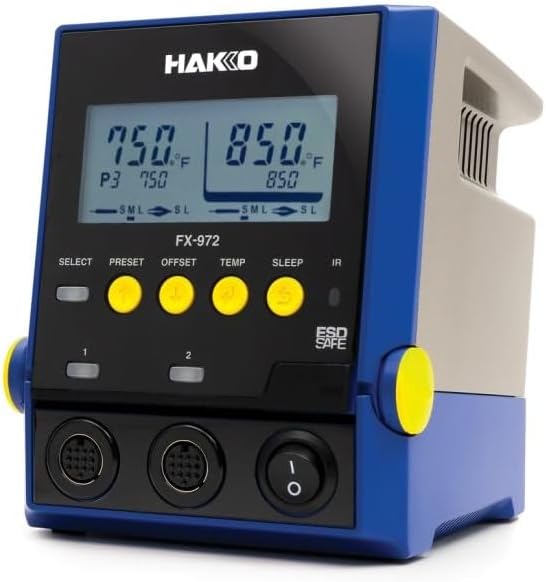 Hakko FX-971 Next-generation soldering station - derived from best parts of the FX-951Compatible with standard and micro handpieces (standard handpiece included)100W capacity, 120-850°F temperature range Uses T39 tips - over 60 shapes and sizes (sold separately)Handpiece sensor detects when the iron is in use or should be put to sleep, eliminating the need for connecting cords Soldering Station with FX-9701 Iron and Stand The HAKKO FX-971 Soldering Station is the next-generation high-performance soldering station that derives itself from the best parts of the HAKKO FX-951 which is arguably the most reliable and cost-effective soldering station in the electronics industry for the last 15 years. The HAKKO FX-971 uses newly designed T39 Series tips with higher power output and optimized geometries to achieve peak performance of the HAKKO Composite Ceramic heater at its heart while maintaining HAKKO’s renowned tip life and low operating costs. The newly designed single-piece handpiece uses a built-in sensor to detect when the iron is in use or should be put to sleep, eliminating the need for connecting cords or in-line irons and holders, and incorporates a thinner cord to reduce the weight felt by the user.The station itself uses a minimal footprint design that allows multiple units to be stacked to conserve workbench space and includes a new easy-to-read display that is more than 4 times larger than the FX-951 and displays set temperature and sensor temperature simultaneously.The operation and setup are similar to the FX-951 but the interface is redesigned to be intuitive and includes new features such as IR auto offset when using the FG-100B Tip Thermometer or FG-101B Station Tester, a preset mode that allows easy selection of up to 5 user programmable presets 3-letter passcode lock for process control, and user selectable sleep temperature.