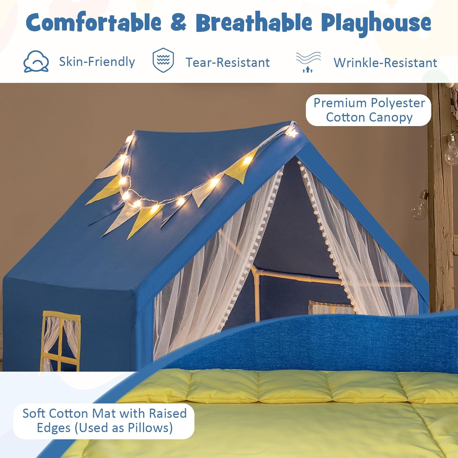 Description: The kids tent is designed with both comfort and style in mind, which will surely be a favorite among your little adventurers. With enough room to accommodate 2 children, your little ones can invite a friend over for a thrilling playtime adventure. Besides, the canopy is crafted from premium polyester cotton, ensuring durability and easy maintenance. To add extra comfort and coziness, the play tent comes with a soft cotton mat with raised edges (used as pillows). Whether it's a cozy reading nook, a secret hideaway, or a fun play space, this toddler tent is sure to become a favorite spot for your little ones. Features: Features a spacious design, allowing it to comfortably accommodate 2 children The premium polyester cotton canopy combines durability with feel The skin-friendly cotton mat features raised edges that can be used as pillows The high-strength thick PVC pipes provide a strong framework, not easy to deform Comes with an upgraded bottom flat threshold to avoid falls, making it safer The breathable gauze curtains and side windows ensure good ventilation The bottom zipper design for easy detaching, convenient to store when not in use Features ASTM and CPSIA certification, ensuring safety during use Features a simple structure, easy to set up, require no tools Specifications: Color: Beige/Blue Material: Polyester Cotton, Cotton, Polyester Fabric, PVC Overall Dimensions: 48” x 42” x 50” (L x W x H) Size of the Padded Mat: 47” x 48” (L x W) Star Light String Length: 5.5 ft Net Weight: 9.5 lbs Requires 2 x AA Batteries (not included) Package Includes: 1 x Kids Play Tent 1 x Padded Cushion 1 x Star Light String 1 x Colorful Flag String 1 x User’s Manual