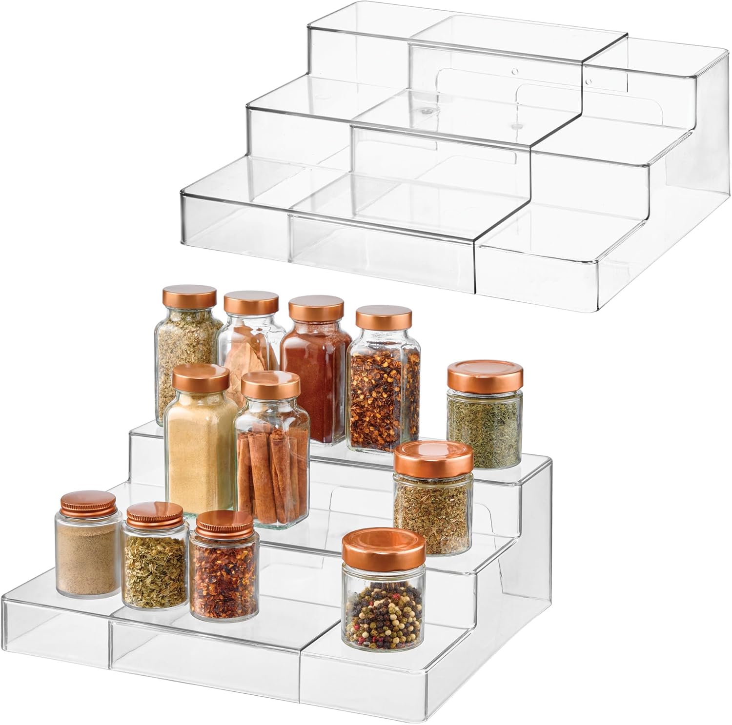 The iDesign Expandable Spice Rack Organizer keeps your favorite herbs accessible by creating a better vantage point inside cabinets. Three generously sized shelves make it easy to grab what you need, and the slightly raised edges prevent items from falling. The expandable design slides to fit your exact storage needs and creates more storage space for seasonings and canned goods. This rack pulls double duty by sorting vitamins and medicine bottles in bathrooms or glitter jars in crafts rooms, making this piece highly versatile to suit your storage needs.