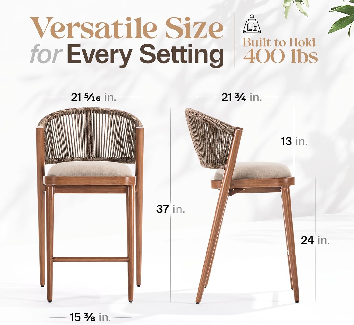 Elegance and comfort to your home with these stylish counter stools with backs, ideal for any indoor or outdoor setting.Blending contemporary design with textured finishes, these rattan counter height bar chairs bring both style and functionality to your dining space.Key Features:Sturdy Build: These kitchen counter chairs feature a robust frame, supporting up to 400 lbs, ensuring lasting durability.Comfortable Seating: Each counter height bar chair comes with a soft, cushioned seat and an ergonomic backrest for comfort during extended use.High-Quality Components: Handwoven rope and rattan counter chairs design offer UV protection and weather resistance, ideal for both indoor and outdoor use.Versatile Design: Ideal for your kitchen island, patio, or dining area, these outdoor counter height bar chairs provide a chic, rustic look with modern functionality.Built-in Footrest: Designed with a convenient footrest for enhanced comfort during seated enjoyment. These rattan counter height bar chairs to your home and elevate both comfort and style effortlessly.