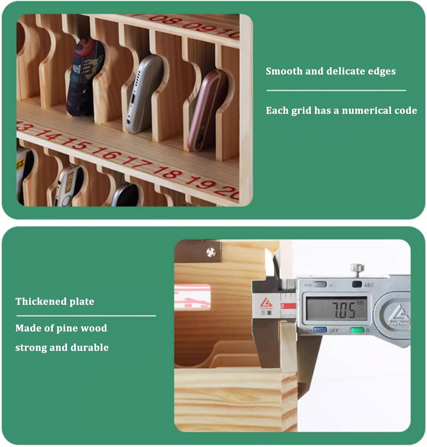 Freestanding Metal Phone Safe Deposit Organizer Box:Introducing our versatile Wooden Cell Phone Cabinet, designed to meet the needs of various environments such as conference rooms, classrooms, factory workshops, and gyms. This practical storage solution helps keep your space organized and clutter-free, allowing users to securely store their devices while engaged in activities or meetings. Crafted from durable acrylic and wood, this cell phone cabinet is both stylish and functional. Available in multiple sizes—10, 20, 30, 40, 50, 60, 70, 75, 80, and 100 grids—this cabinet can accommodate a wide range of needs. The natural wood color adds a touch of elegance, making it suitable for any professional or educational setting. Our cabinet features include easy wall mounting for space efficiency, a built-in security lock for added safety, and clearly numbered grids for quick identification of devices. No more lost phones or confusion during busy moments—your users will appreciate the convenience and organization this cabinet provides. Ideal for use in meeting rooms, classrooms, and gyms, this cell phone cabinet helps promote a focused atmosphere by ensuring devices are stored safely and out of sight. Please note: - The package includes one cell phone cabinet and its accessories only; other items are not included. - Measurements are taken by hand, and there may be a 1-2CM variance. - Due to lighting and photography settings, actual product colors may differ slightly from images. Enhance your workspace with our Wooden Cell Phone Cabinet, where functionality meets style!