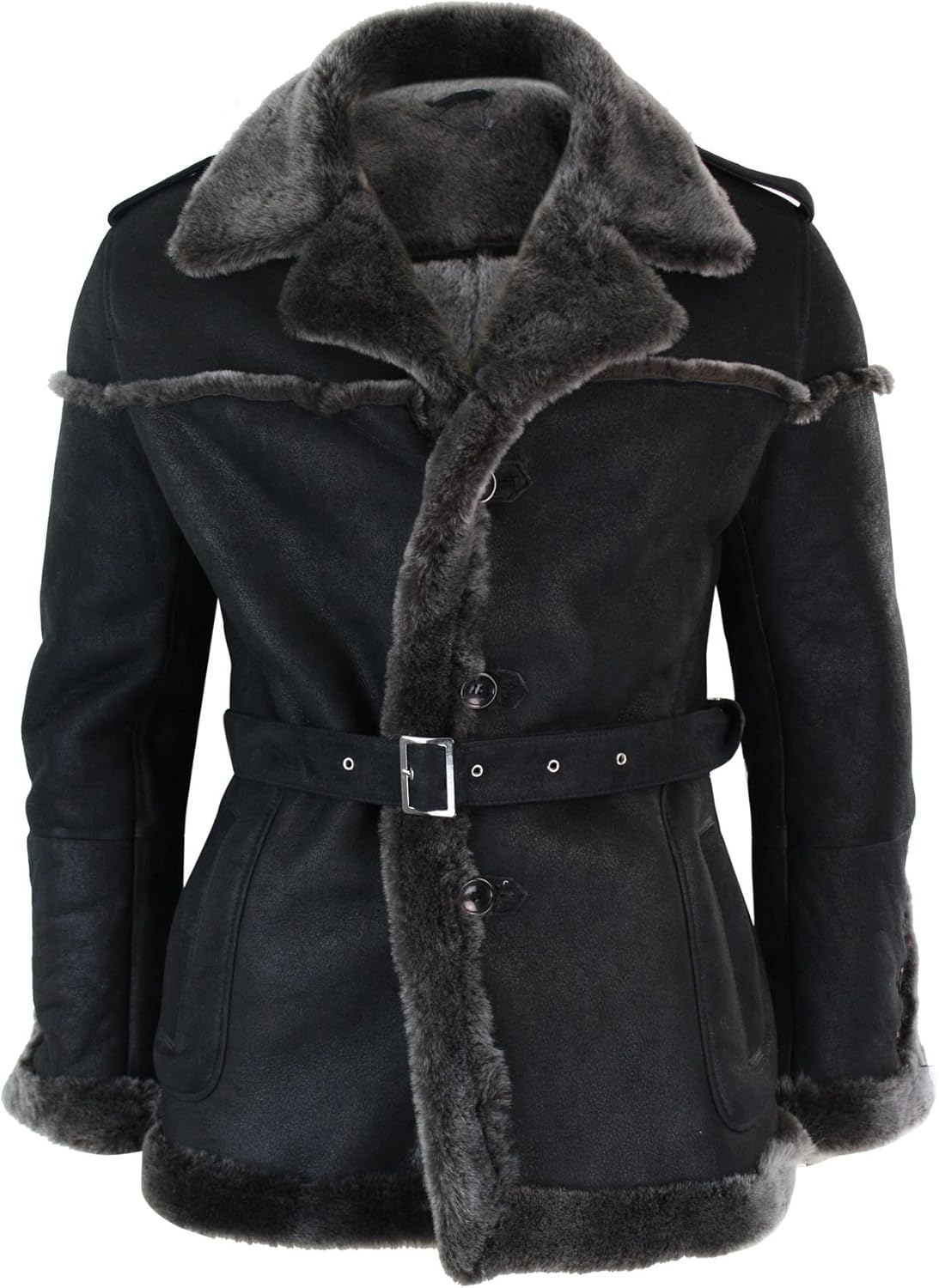 100% Authentic Soft Premium Sheepskin Coat. Natural Sheepskin with Contrasting Grey Fur & Black Exterior. Ideal for Cold Weather & Winter, Belted Style. Suitable for Casual & Smart Casual Wear, High-Quality.