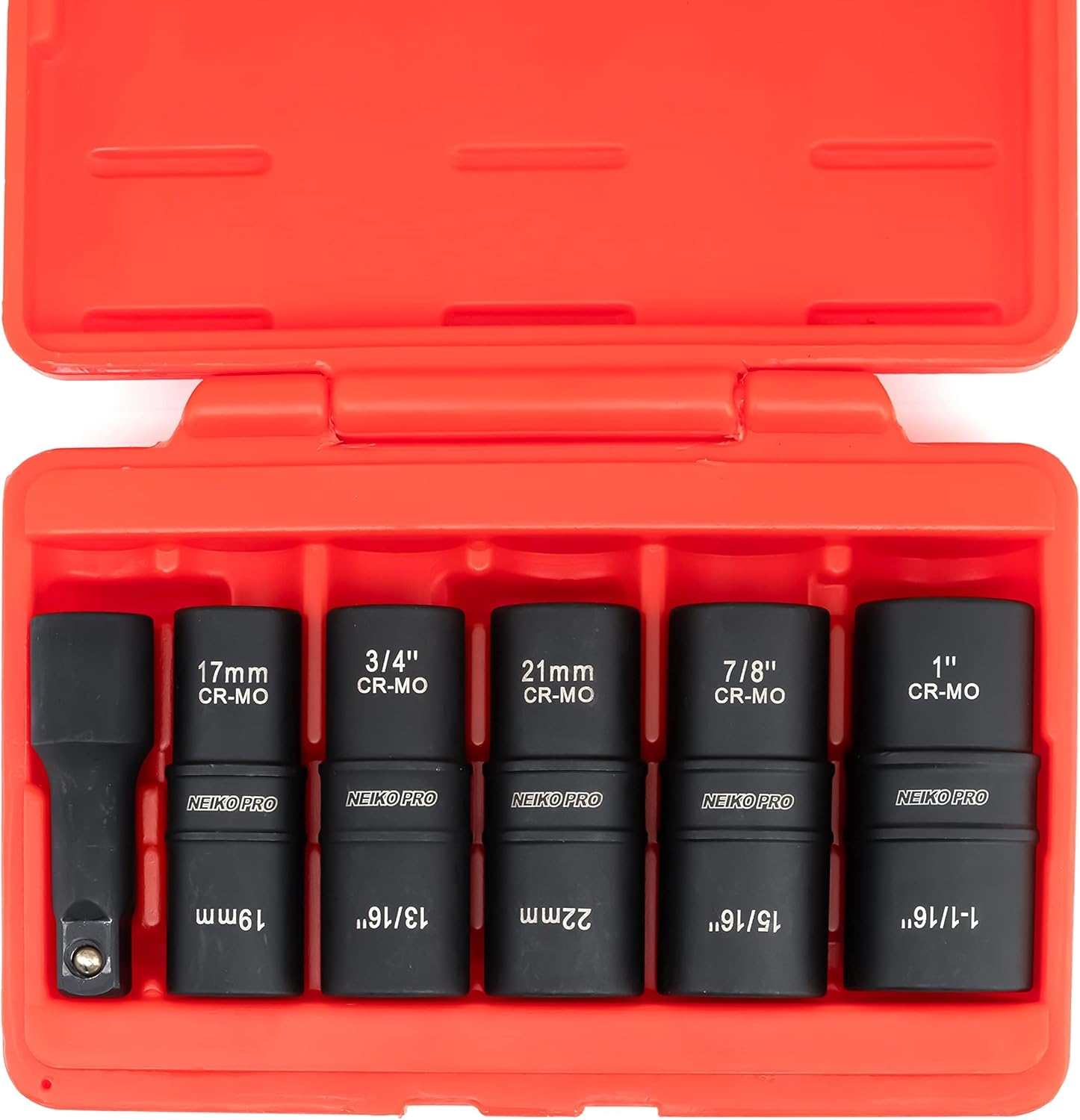 NEIKO presents our 1/2-Inch-Drive Impact Socket Set with deep SAE and metric sockets. Each socket is constructed from chrome molybdenum steel for maximum life and durability and has a black phosphate coating that protects it from oil, dirt, and grease. Each socket also has an easy-to-read laser-etched size marking for quick identification and a thin 6-point wall design that allows you to reach recessed lug nuts easily. This socket set is the perfect addition to any mechanic’s toolbox for reliable fastener removal.Unlike other socket sets, this impact set includes 5 dual-sided flip sockets that can easily be flipped over for a total of 10 sizes. It comes with one 3-inch extension bar, 2 standard-sized SAE sockets (3/4" x 13/16", 7/8" x 15/16" and 1” x 1-1/16”, and 2 standard-sized metric sockets (17 x 19 mm and 21 x 22 mm).This lug nut–removal tool set comes in a convenient blow-molded case that keeps all parts securely in place and allows for easy organization, quick access, and easy travel to and from the jobsite. Whether you need this high-quality socket set for use on your personal car or for professional automotive mechanic jobs, it will help you get the job done quickly and efficiently for years to come. Includes: 1 x 7/8" x 15/16" 1 x 1” x 1-1/16” 1 x 17 x 19 mm 1 x 21 x 22 mm 1 x 3” extension bar
