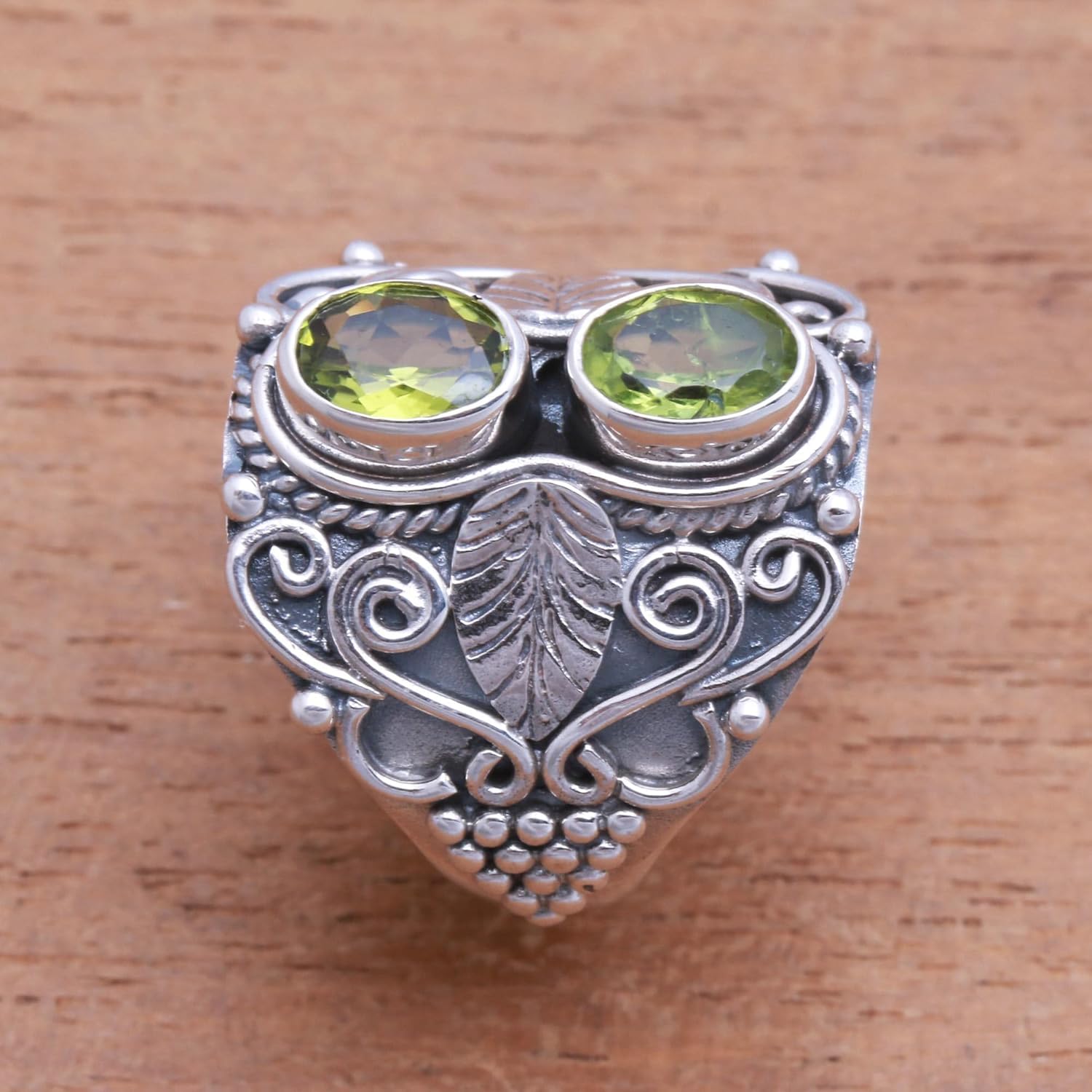 Novica works together with talented artists, artisans, and designers around the world to produce stunning, keepsake handmade treasures. Our mantra is to Spread Happiness, so rest assured - we’ll do everything we possibly can to ensure you’re a happy customer!About this item: Flanked by leaves of sterling silver, two ovals of faceted peridot glisten with verdant hues. Balinese artisan Made Sugi creates this cocktail ring, circling the finger with intricate swirl and dot patterns in sterling silver....