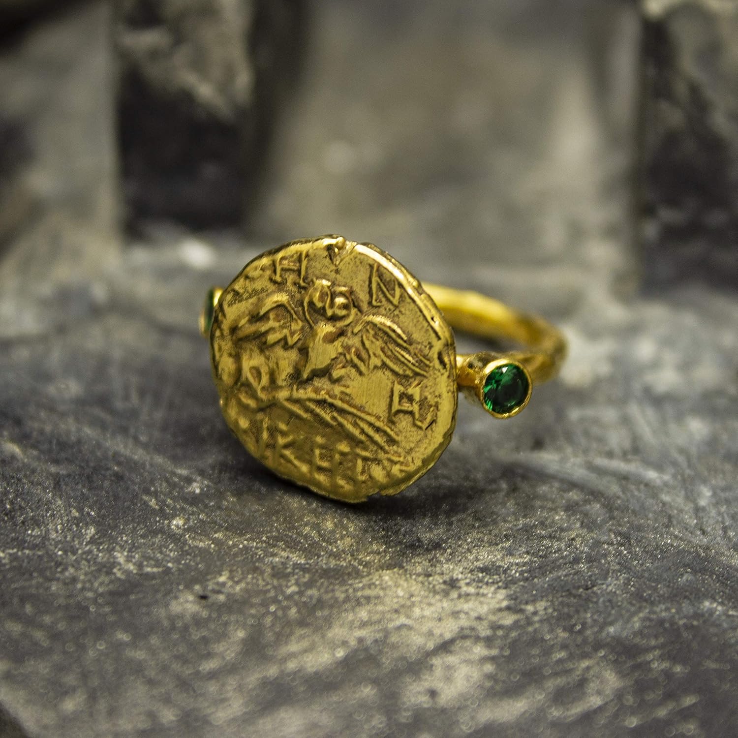 DescriptionAncient Greek Owl Athena Coin Ring | 24K Gold Plated 925Sterling Silver | Gold Greek Athenian Tetradrachm Ring | Handmade Ring Handcrafted hammered full round ring band size measures 2mmin width and 24k gold plated bronze coin 14.5x14.5 mmHammered RingOur shop offer free ring sizing and color options.DetailsMetal : 925 Sterling SilverPlated : 24K Gold Band Width : 2 mmGem Stone : Green Diamond Cut Cubic ZirconiaGem Color : Green,Navy Blue,Purple,Blue,White,Red(The color you want is made for free).Gem Size : 3 mmCoin : Reproduction Bronze CoinCoin Size : 14.5x14.5 mmRing Weight : 5.2 gramsRing Size : US 6 (The size you want is made for free).(We used the US standard sizing)Plating Options(FREE) **Custom Orders isMade** As Pellada family, we will be happy to help you if youcontact us with the photo and dimensions of the design you want. Thank you forshopping!