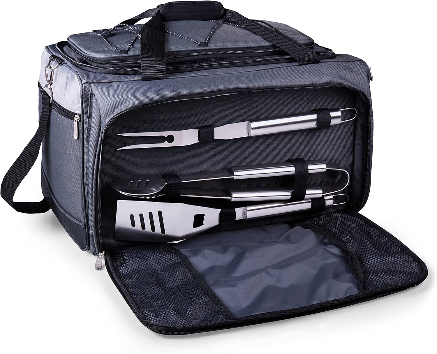 This NCAA team logoed Buccaneer is the ultimate tailgating cooler/barbecue set in one. This patented, innovative design features a large insulated and fully-removable, water-resistant PVC cooler that measures 16 by 8 by 7-inches and holds up to 24 standard size beverage cans. Unzip the cooler from the main tote to access the portable charcoal barbecue grill with lid that is also included. For grilling, we have also included one black drawstring bag to hold the grill, and three stainless steel tools with aluminum handles and non-slip thumb grips: 1 large spatula with a built-in bottle opener, grill scraper, and serrated edge for cutting, 1 pair of tongs, and 1 BBQ fork. The cooler has two carry straps on either side, and features a mesh pocket on the interior lid that can hold a large ice pack/gel pack. The cooler conveniently nests inside the compartment that houses the portable BBQ, allowing you to transport the BBQ and a fully-loaded cooler at the same time. This amazing Buccaneer also features an adjustable shoulder strap with comfort pad, a reinforced waterproof base, three large zippered exterior pockets to store personal effects, padded carry handles, and a stretch cargo cord on the top of the tote to carry a blanket or towel. WOW.