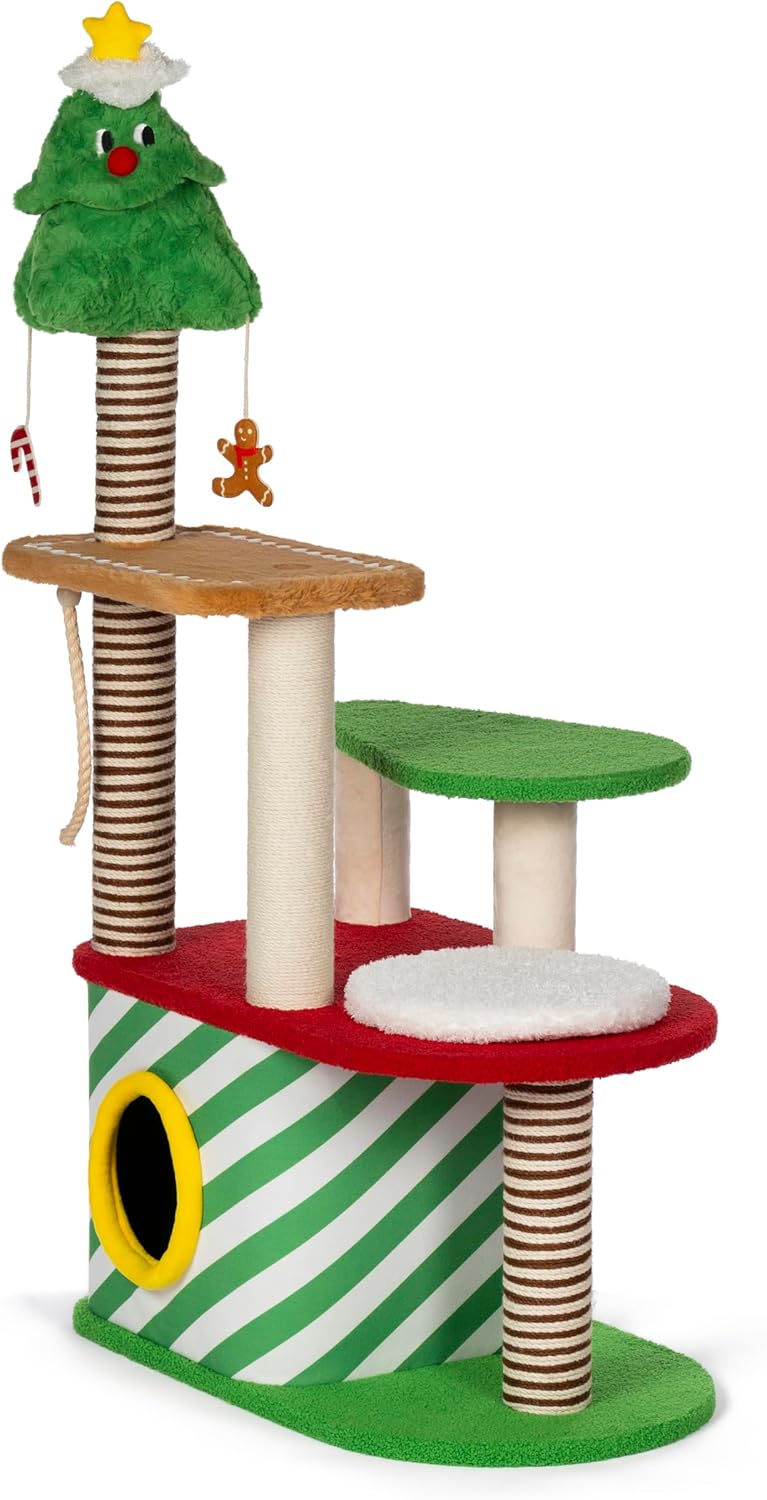 Kringle Cat Chateau (#81015) cat tower from Prevue Pet Products provides a jolly play center with immersive holiday-themed activities and comfort amenities. For playtime fun, swat the decorations or the dangling rope. Activate crinkly sounds playing with the tree-topper toy. Strengthen paws on any of the multiple scratching posts. For long winter naps, curl up in the roomy ground-level hideaway. The Chateau is the next best thing to an overnight stay at Santa Kitty’s Christmas Wonderland. Dimensions: 27-3/4”L x 20”W x 53”H