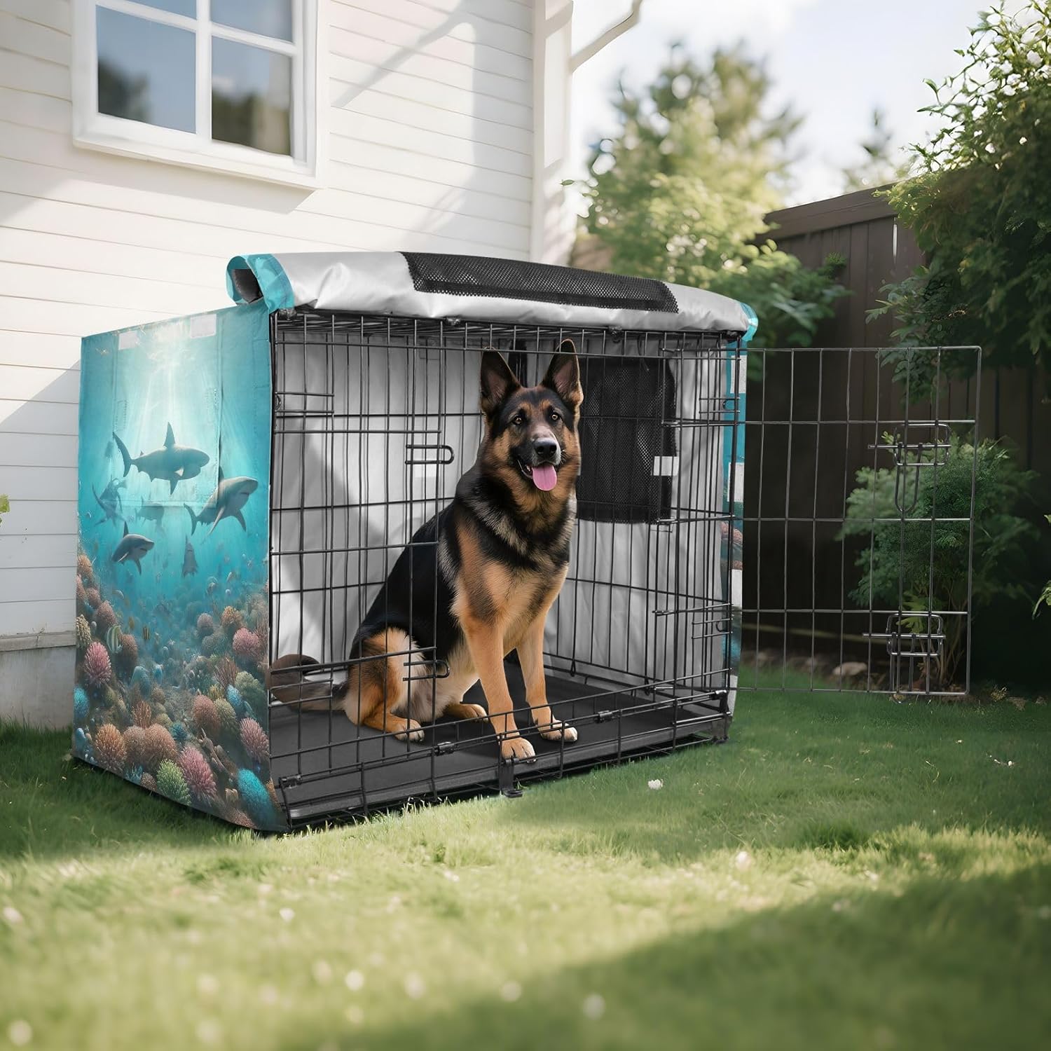 High-Quality Material – Crafted from 600D silver-coated oxford fabric, this breathable pet cage cover offers weather-resistant protection against rain, wind, and sunlight. It helps to keep your pet safe and comfortable, ensuring the crate remains in good condition.Fast and Easy Setup – The fastening system allows for a quick and straightforward installation process, making it ideal for pet owners who need an efficient solution for their dog crate cover.Breathable Design – With mesh windows on all sides, this cage cover ensures consistent airflow, which helps keep your dog cool and comfortable while inside the crate. The breathable mesh also provides privacy and reduces stress.Sturdy and Wind-Resistant – Four tie-down straps securely fasten the cover to the crate, ensuring it remains stable even in windy conditions. This feature prevents the cover from being blown off or moved out of place.Convenient for Travel and Home – This versatile travel dog crate cover is designed for both home and travel use, providing a reliable solution for your pet's needs. Whether you're indoors or on the move, it offers excellent protection for your dog’s crate.