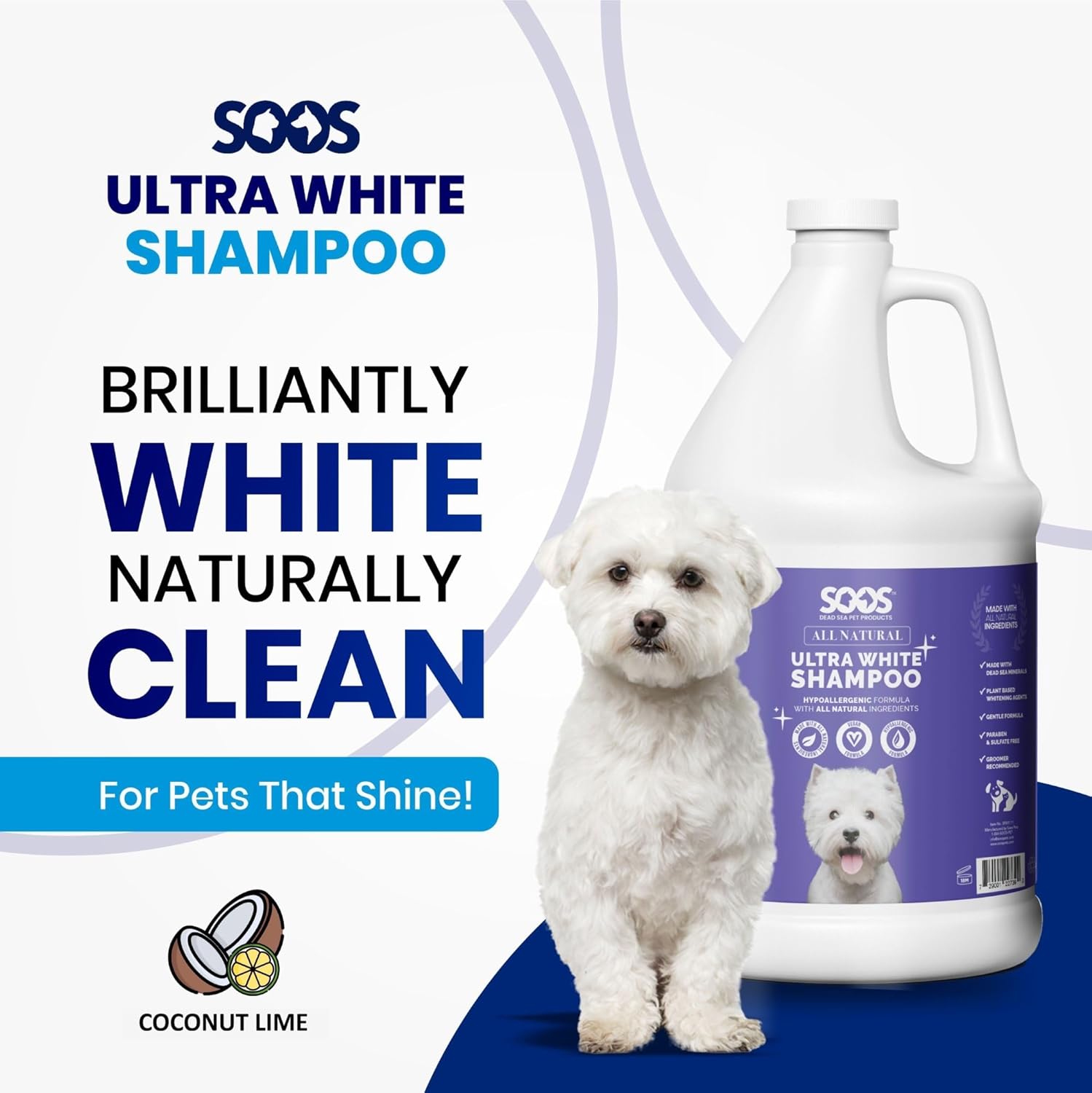 SOOS: Our All Natural Ultra White Hypoallergenic Shampoo for Dogs and Cats is the perfect solution for pet owners who want a safe and effective way to brighten and nourish their pet's coats. This luxurious shampoo is made with natural ingredients and plant-based whitening agents that gently cleanse and brighten your pet's coat. It is specially formulated for pets with sensitive skin and is free from parabens, sulfates, fragrances, and dyes that can cause irritation reactions. Our shampoo is suitable for both dogs and cats and is cruelty-free and eco-friendly. PRODUCT PARAMETERS: Condition: 100% New Type: Pet Shampoo Sizes: 4L Gallon Package: 1x Ultra White Hypoallergenic ShampooBENEFITS: PARABEN AND SULFATE FREE: Our formula is free from parabens and sulphates, which can cause skin irritation and dryness in some pets.GENTLE FORMULA: The gentle formula is perfect for pets with sensitive skin. It nourishes and moisturizes the coat without causing any discomfort or irritation.DIRECTIONS FOR USE: 1) Begin by wetting your pet's coat with warm water. Make sure to thoroughly wet the entire coat. 2) Apply a generous amount of shampoo from the base of the neck to the tail. 3) Gently massage the shampoo deep into the coat and skin, working it into strands. 4) For best results, let the shampoo sit for 1-2 minutes to allow it to penetrate the coat and skin. 5) Rinse the shampoo out thoroughly with warm water, making sure to remove all traces of shampoo from the coat. 6) Towel dry your pet and allow them to air dry completely before brushing or styling their coat. 7) Store the product at room temperature in a cool, dry place.NOTE: Please use only as directed, and avoid contact with your pet's eyes or mouth. If any irritation occurs, discontinue use and consult with your veterinarian.