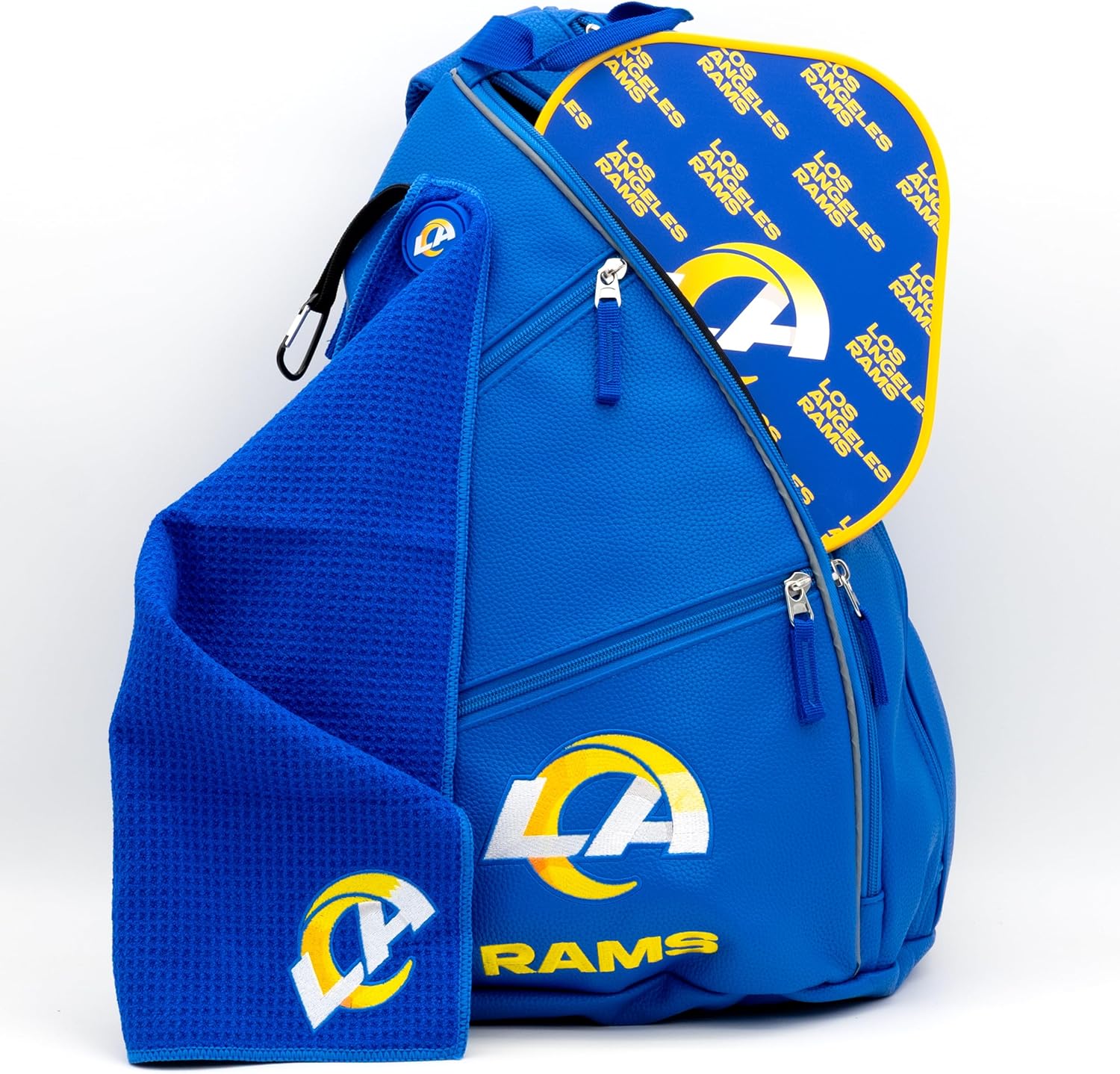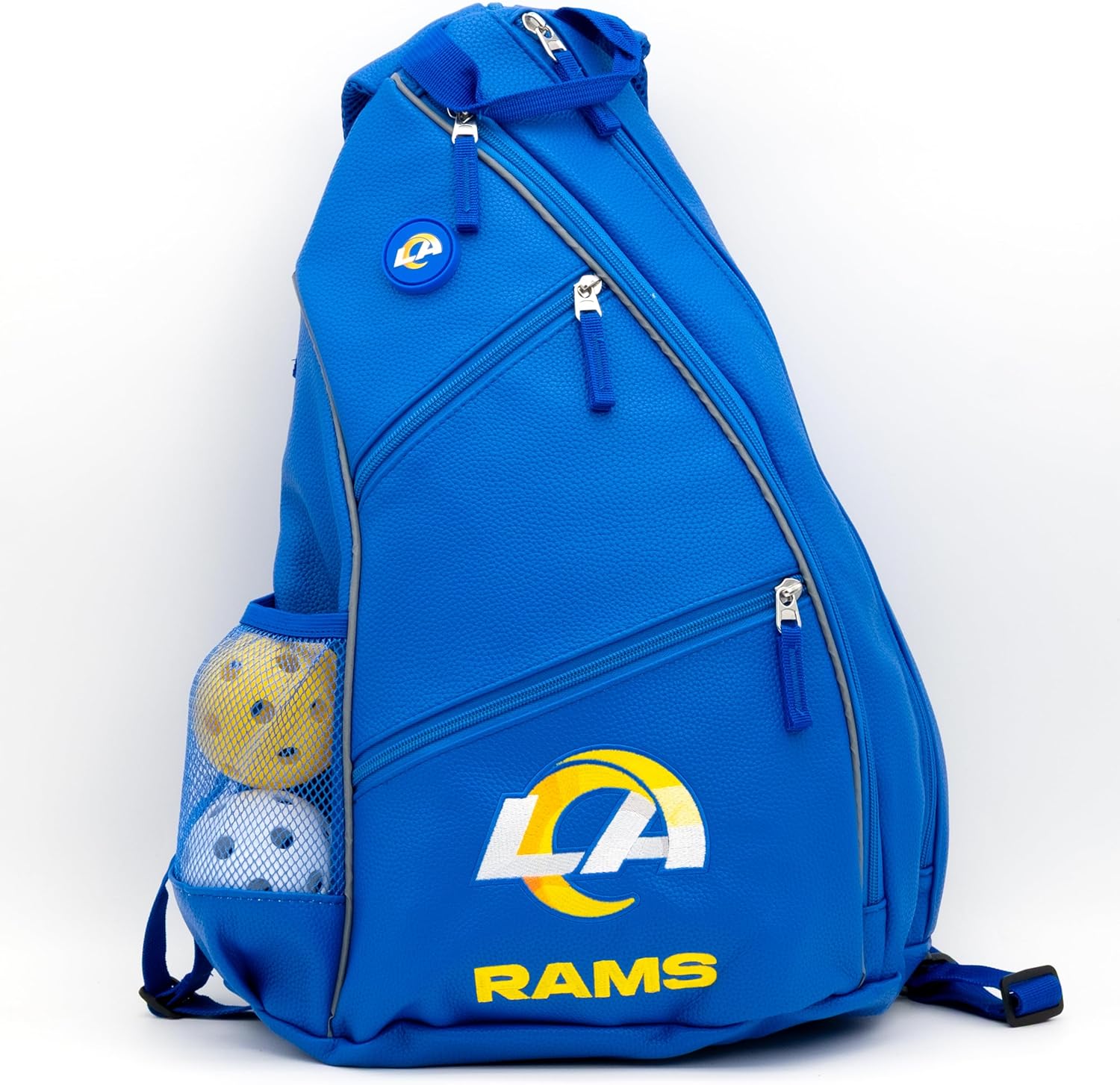 The PU Leather Embroidered Team Backpack features a magnetic towel catch, five zippered pockets and four internal mesh pockets, water bottle pocket and ergonomically designed straps for shoulder or cross-body carry.