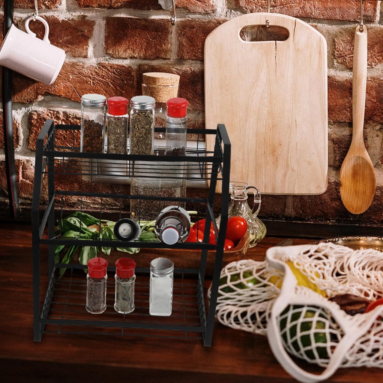 Package List 1 x Condiment Storage Rack Features - Material: Carbon Steel. - Color: Black. - Note: Three-layer design seasoning rack. -Product Info:Multi-layer seasoning rack - Size: About 38.00X32.00X18.00cm/14.93X12.58X7.07inch. - Multi-functional seasoning shelf, saving space and make life more orderly. For the home or professional organizer kitchen rack. - Selected carbon steel materials, stylish personality, environmentally friendly and tasteless. - Instantly create additional storage in kitchen, closets, cabinets, tabletop and more. Stronger storage capacity kitchen shelves. - This rack designed with large capacity, can store a variety of kitchen utensils and appliances seasoning, tidy storage, less Storage Rack. - Perfect for small-space living as well as apartments, condos, campers, cabins and tiny homes Kitchen Organizing Rack.Goods Informationthree-layer spice storage rack Use this rack, saves tons of space and time by making it easier to access various utensils and supplies.Seasoning Bottle makes your kitchen more clean and tidy and organized.racks for storage This kitchen seasoning bottle storage holder is well-made of , which is and not easily deformed