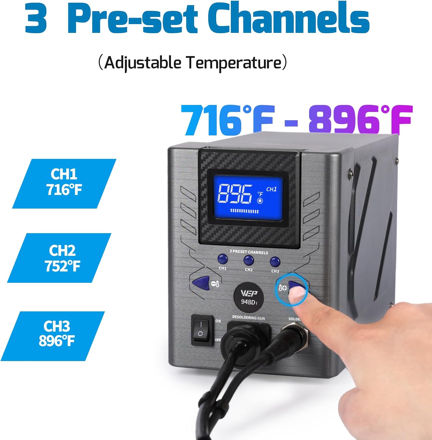 | Included Components | WEP 948D-I Desoldering Station; 4*replacement desoldering nozzles (0.8mm, 1.0mm, 1.2mm, 2.0mm); detachable desoldering gun; desoldering gun holder; 1*heat-resistant silicone pad; a set of cleaning pins; 10*filtration adsorbers; 5*ceramic filters; 1*vacuum receptacle cover; 1*solder residue storage chamber; 2*solder residue filter spring; 2*retainers |