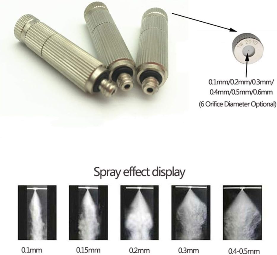 Characteristics:100% brand new and high.Sturdy brass body with stainless steel orifice.Builtin a filter, antiblockingWidely used in humidifying the textile workshop, landscaping, cooling, air humidification, spray disinfection, quarantine, air purification deodorant, etc.Characteristics:Material: Brass (Nickel plating finished)Color: Brushed nickelThread Size: UNC1024 or 3/16"Hole: 0.1mm, 0.2mm, 0.3mm, 0.4mm, 0.5mm, 0.6mmFlow rate: 1025ml/min; 2046ml/min; 4989ml/min; 80145ml/min; 95178 ml/min; 130243 ml/min;pressure: 2070kg/cm (280995PSI)Included in the package:100pcs x brass misting nozzles (6 Orifice diameter available)(Does not include Tees and other accessories)
