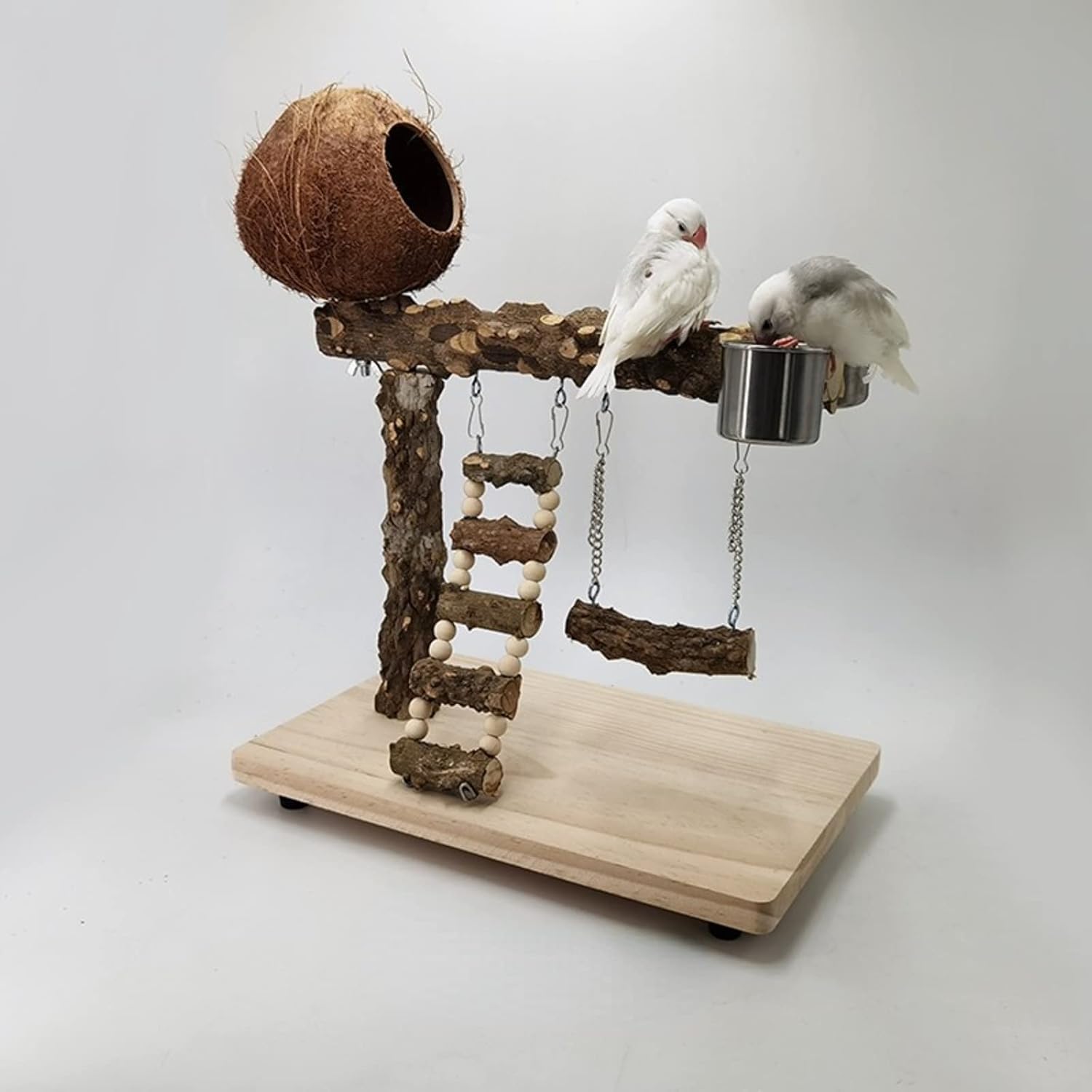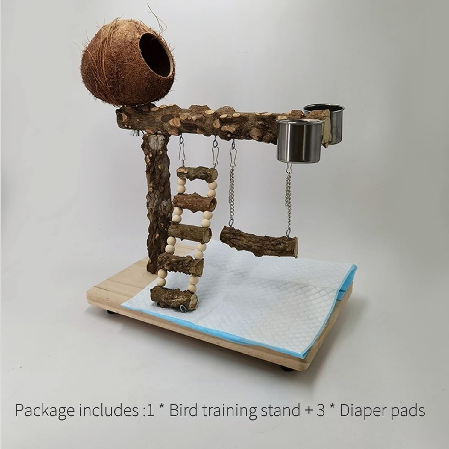 Feature and Function:♥ Natural wood, 100% safe for your pet to chew, play and rest.♥ Easy to install, connected by screw, firm and safe.♥ Portable and lightweight, you can carry it from room to room.♥ Helps your pets to reduce loneliness and play with them when their owner are not at home.♥ Provide essential physical activity and reduce aggression & loneliness for your birds.♥ Provides excellent foot exercise and nails trimmed naturally,safety to chew as well.♥ Keep your parrots in a stable and happy mood and improve their health.Suitable Bird Breeds:Perfect for parakeets, cockatiels, green cheek, lovebirds, cockatoos, conures, budgie, finch and other small medium birds.Package:1 * Bird training stand + 3 * Diaper pads