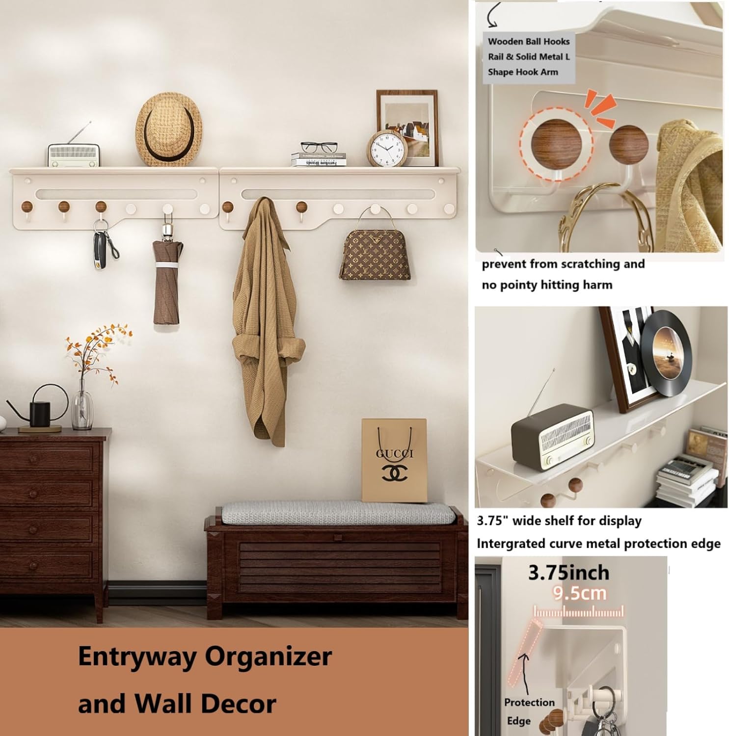 Transform your entryway or hallway with this elegant wall-mounted coat rack and shelf combination. The sleek design features a spacious top shelf perfect for displaying decorative items, photos, or everyday essentials, while the sturdy hooks below provide ample storage for coats, bags, and accessories. The clean lines and neutral white finish complement any home décor style, from modern to traditional. The wooden accent pegs add a warm, natural touch to the overall design. This versatile piece helps keep your space organized while adding functional style to your walls.
