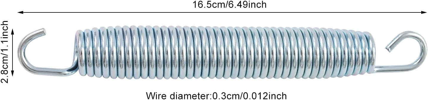 ApplicationThis product can be used to replace old and worn-out trampoline springs and is an ideal choice for trampoline maintenance and upgrades.SpecificationsColor: SilverStyle: ModernMaterial: SteelProcess: GalvanizationNumber of Pieces: 48Wire Diameter: 0.3cm/0.12inEach Spring Outer Diameter: 2.8cm/1.1inEach Trampoline Spring Length: 16.5cm/6.49inPackage Size: 20*20*20cm/7.87*7.87*7.87inGross Weight: 6.3kg/13.89lbsNet Weight: 5.98kg/13.18lbsPackage Included48* Trampoline Springs1* T-shaped Tool