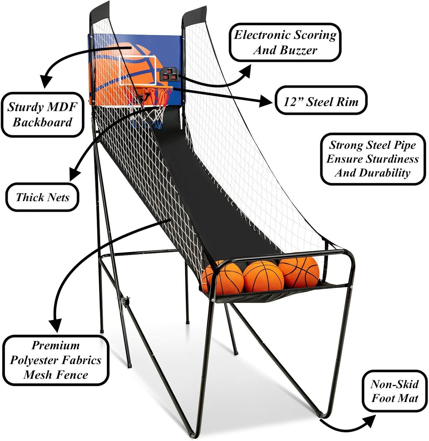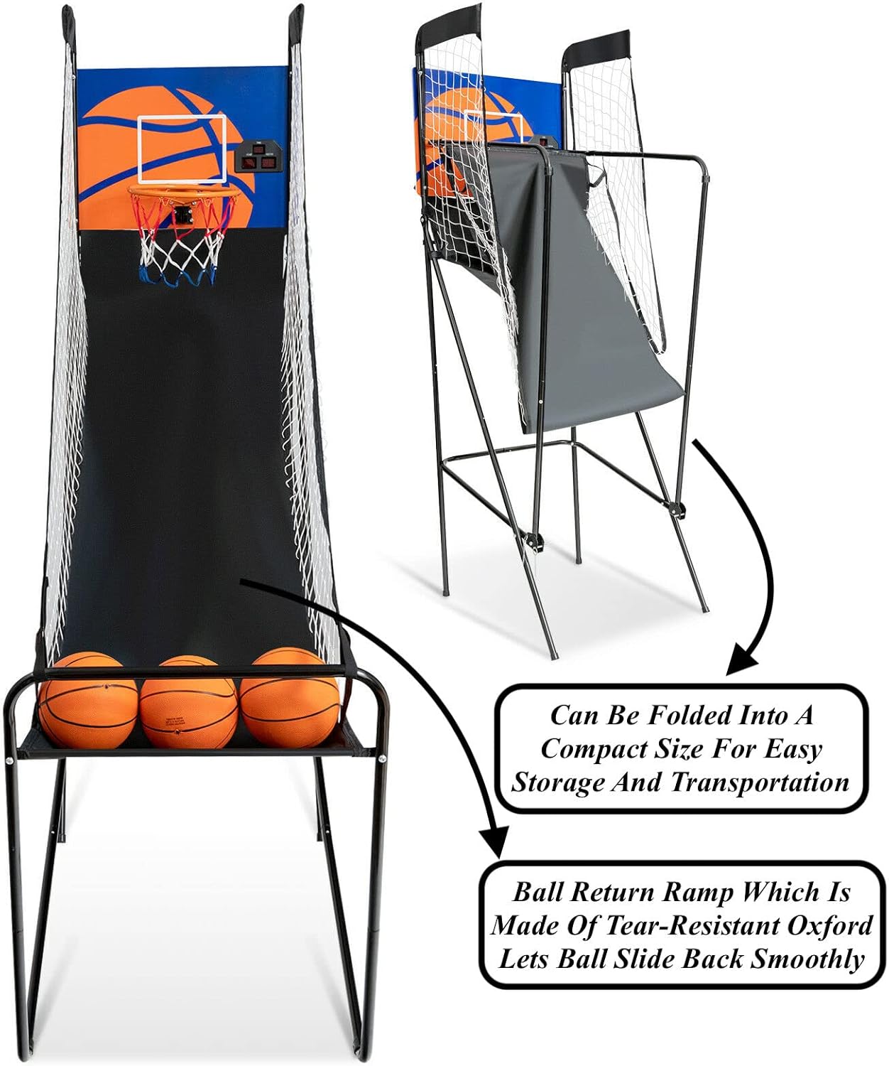 This basketball arcade machine comes with 3 basketballs and a pump, allowing you to enjoy single shooting time and improve your skills or challenge your family and friends in an exciting race. The whole machine is constructed with durable steel frame to ensure a stable and safe playing experience. The rim is also crafted with sturdy steel for bearing the hit of the ball while the ball return ramp is made of tear-resistant Oxford to make the ball slide back smoothly. When not in use, you can fold it into a compact size for convenient storage and saving space. Specifications Color: Black Material: Steel, Oxford, MDF, Polyester Fabric Assembled Dimension: 82” x 24.5” x 82” (L x W x H) Folded Dimension: 35” x 24.5” x 82” (L x W x H) Net Weight: 25 LBS Basketball Rim Diameter: 12” Basketball Diameter: 7” Package includes 1 X Arcade Basketball Game Machine 1 X Pump 3 X Basketballs 1 X Instruction Note Please refer to the dimension and size of the product before purchasing.