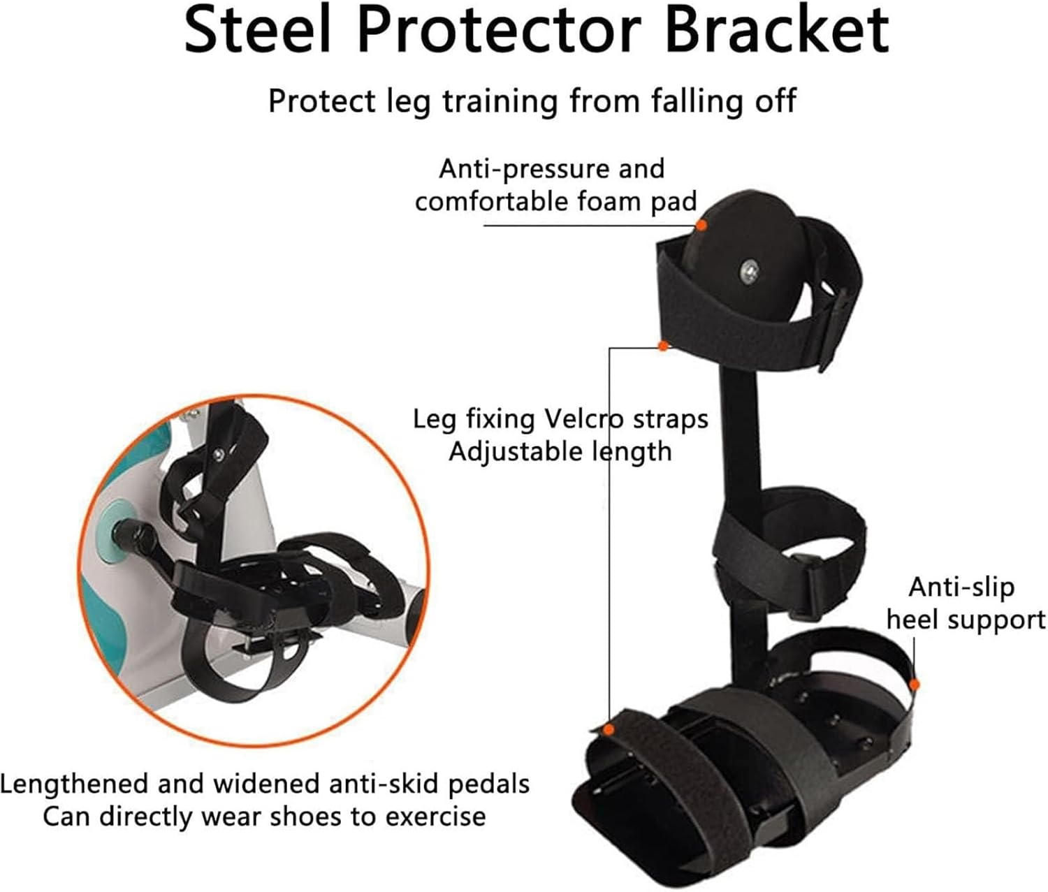 The leg strength of stroke patients with hemiplegia is small, and the leg cannot be fixed on the rehabilitation machine and the rehabilitation bicycle, the product can be used to assist the foot fixation when training, so as to help patients with leg exercise. Feature 1.Easy to install, the iron foot cover is strong and firm, and the hook & loop is attached to make it easy to fix the feet. 2.Perfect design: This product adds two straps to the foot to solve the problem that the bracket is not fixed firmly. 3. Effective anti-slip: Raise the bump at the bottom of the bracket to increase resistance and prevent slippage. 4.Large contact area: The foot pedal slot is enlarged and the attachment is stronger. Let the rehabilitated use more reassurance. 5.Multi-functional: It is suitable for most exercise bike pedals. There are no situations that make it difficult to pair. Specification Material: iron Product size: 18*12*25cm Packing size: 22*15*30cm Weight: gross weight 2.1kg Package Included 1* Rehabilitation machine Leg Ankle Braces Note This product is only used to fix your legs in the rehabilitation bicycle. The rehabilitation bicycle in the picture is only used to illustrate the purpose of the product and is not included in the package.