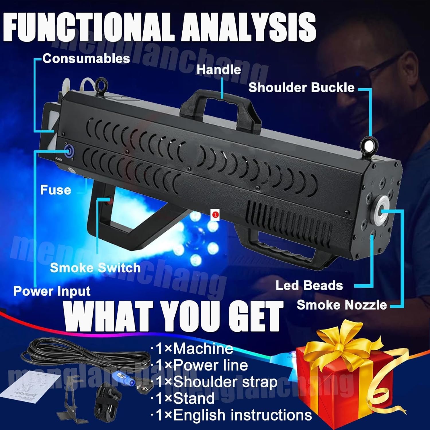 ✨Unleash incredible fog effects and dynamic lighting anywhere with powerful 1500W handheld fog machine. ▶️Key Features & Benefits:▶INSTANT, POWERFUL FOG OUTPUT: Our 1500W pro haze machine generates a massive volume of thick, consistent fog instantly. Project dramatic, low-lying haze or intense smoke jets up to 8-10 meters (26-33 ft)▶IMMERSIVE 7-COLOR RGB LIGHT SHOW: Watch the smoke come alive! Integrated high-brightness LED beads project a dazzling 7-color automatic light show that seamlessly syncs with the fog output. ▶ULTRA-PORTABLE & HANDHELD DESIGN: The ergonomic design and included strap make,note: The machine is plugged into the power cord for use,Create amazing special effects wherever you need them▶LONG-LASTING PERFORMANCE: The large 0.3-liter tank ((not include fog juice/fluid) supports up to 30 min of continuous operatio▶EASY & SAFE OPERATIO: Features a clear digital display and simple button controls.Designed with a reliable cooling system for sustained use. ▶️Specifications:Power: 1500WLight source: 1W RGB LEDMaterial: SteelControl method: Handheld smoke sprayFuel tank capacity: 0.3liters(not include smoke oil)Usage time: 30minNet weight: 5.9kgGross Weight: 7.2kg▶️How to Use:1. Fill the Tank: Pour fog juice into the fuel tank(not include smoke oil).2. Connect Power: the machine into a power source.3. Preheat: Press the POWER button and wait approximately 5 minutes for preheating (unit will indicate readiness).4.Adjust Smoke Volume: Set desired fog density using the digital display and adjustment buttons.5. Activate Fog: Press the spray button to release smoke.- Can be used as a handheld device (with a strap) or as a ground device (with a stand)for Long time handheld use if needed.▶️What’s in the Box:1 x Handheld Fog Machine1 x Strap 1 x stand