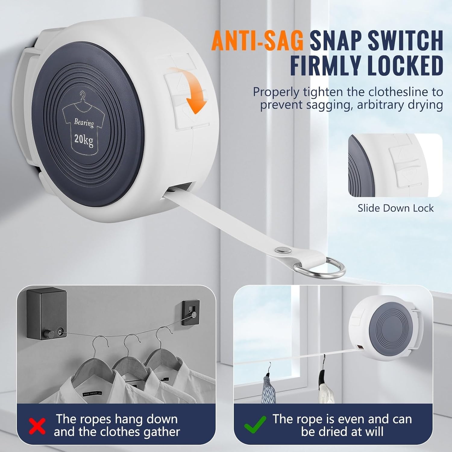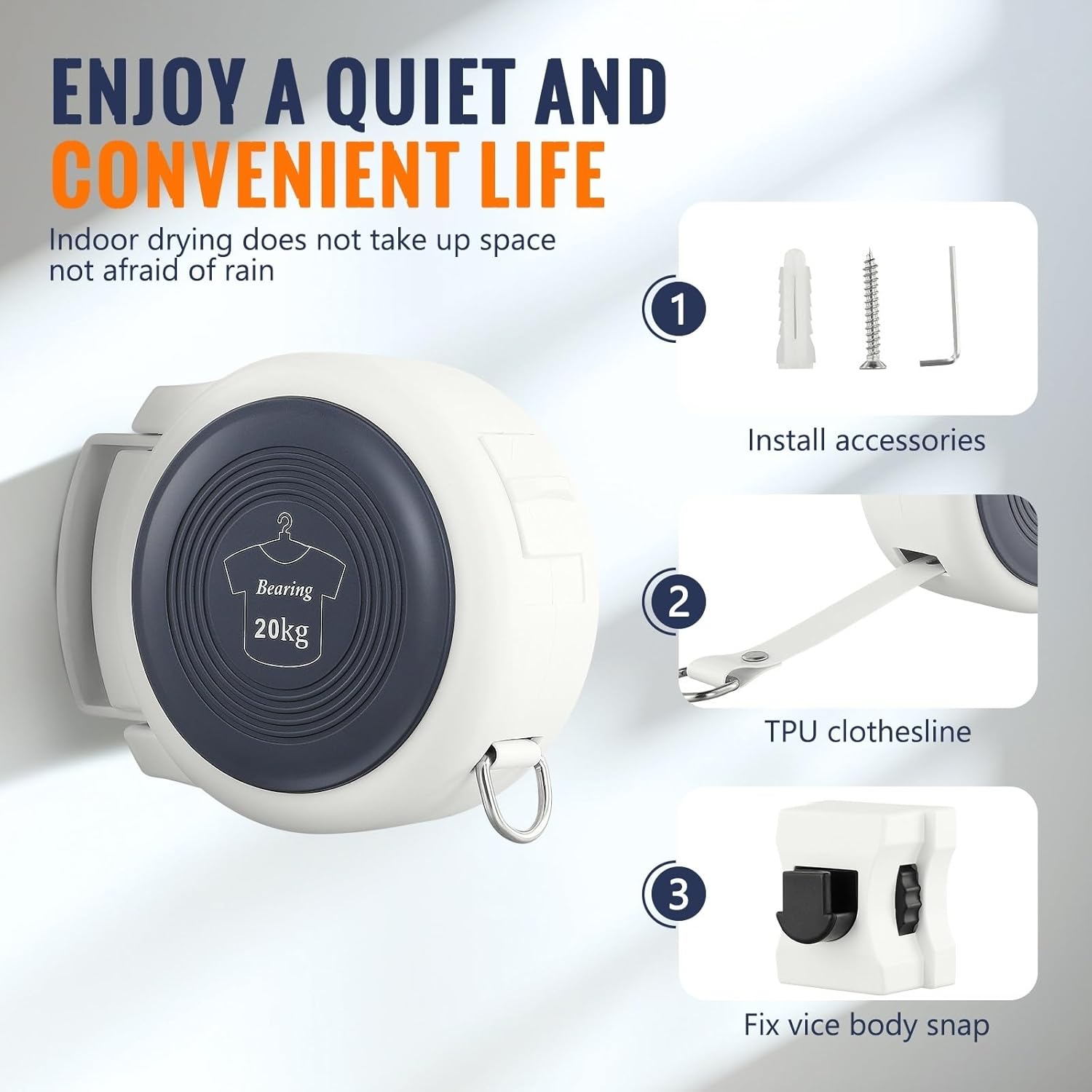 Weather Resistant: This clothesline is designed to be weather resistant, ensuring it can be used in rain and sun exposure You can use it outdoors without worrying about damage, making it a reliable option for drying clothes outsideSpecification:Material:ABS,Aluminum,Stainless steelRope Length:4.2mBearing Capacity: 20KGPackage included:1 x Retractable Clothesline1 x Mounting AccessoriesNote:1. Due to different lighting and screen settings, the product color may be slightly different from the picture.2. Please allow small error due to manual measurement. Thanks for your understanding.