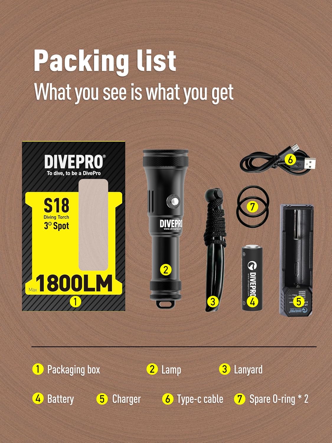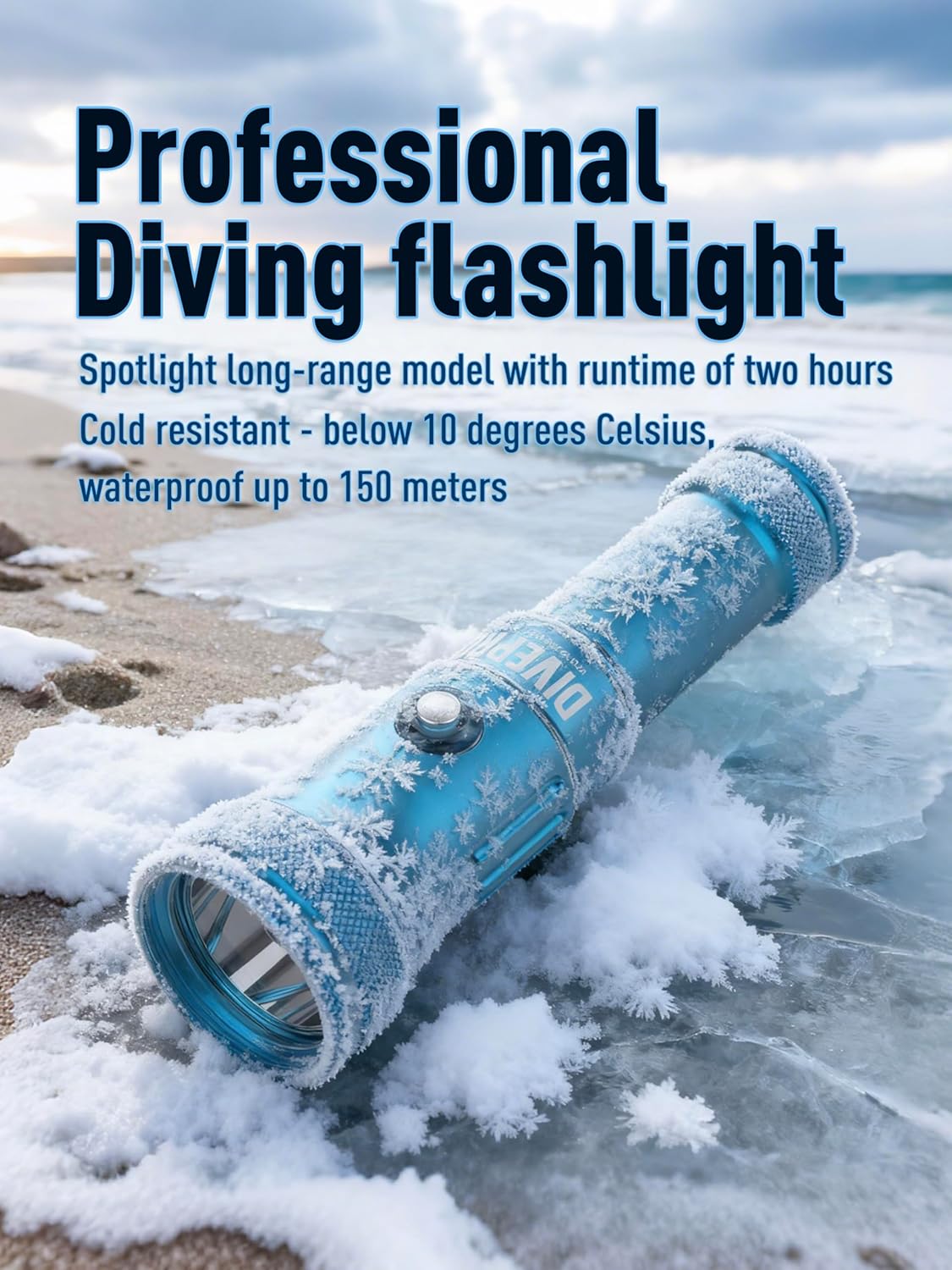Illuminate the depths with this powerful 1800-lumen professional diving flashlight. Featuring a unique 3-degree beam that creates a stunning 'lightsaber' effect underwater, this light also includes a 40-degree floodlight on the side for comprehensive visibility. With its impressive 150-meter waterproof rating and cold-resistance capability below 10°C (50°F), this flashlight is built for extreme conditions. The 2-hour runtime provides reliable illumination throughout your dive, while the impressive 58000 lux at 1-meter distance ensures crystal-clear visibility. Perfect for technical diving, underwater exploration, and open scuba diving scenarios, this robust light helps you navigate dark waters with confidence. The dual-beam design makes it versatile for both focused inspection and wide-area illumination, making it an essential tool for professional divers and serious enthusiasts alike. The durable construction and professional-grade specifications make this flashlight a reliable companion for challenging underwater missions.