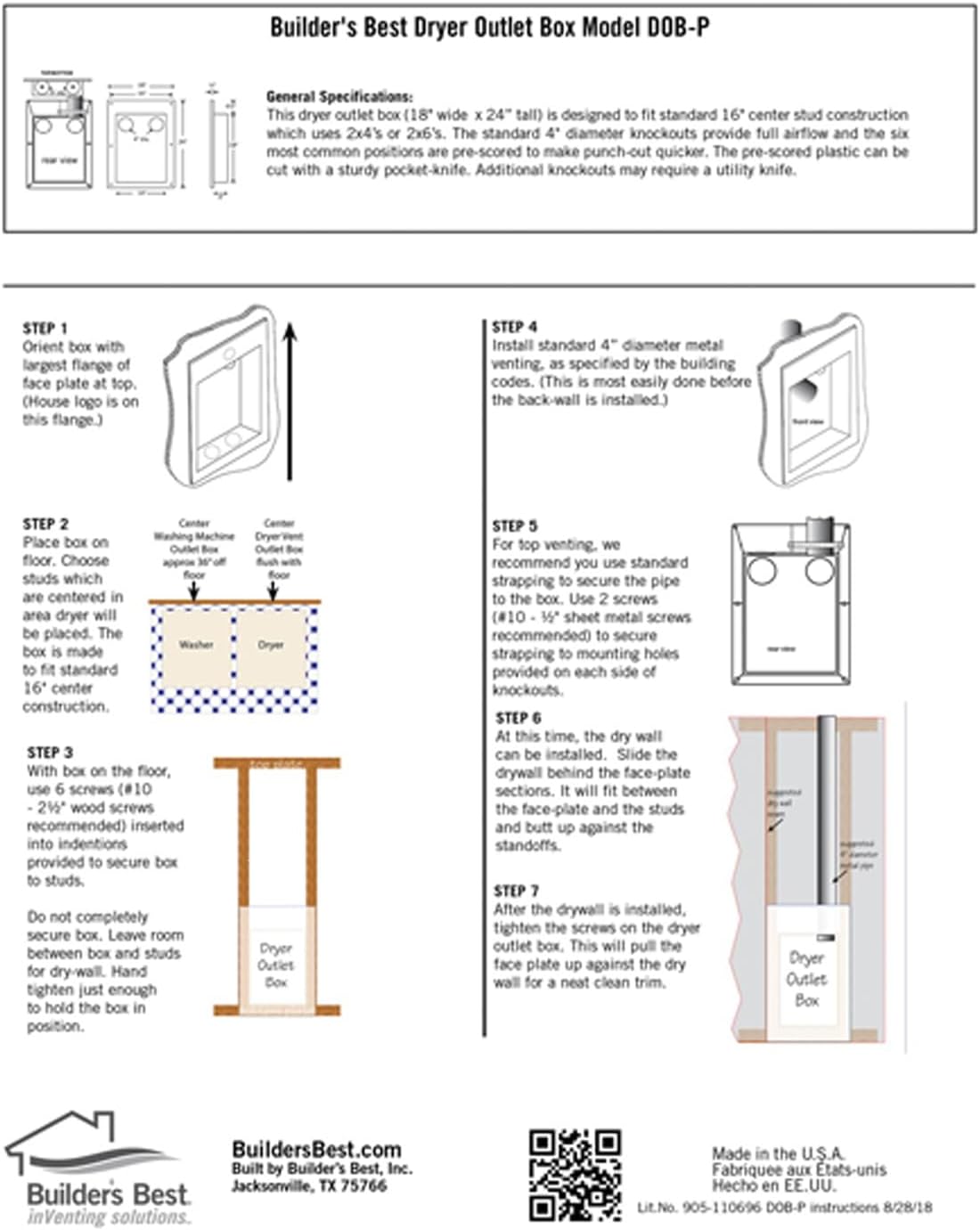 The Saf-T-Duct Dryer Outlet Box from Builder's Best finishes off dryer vent rough-ins and easily adds or recaptures space in the wall behind your dryer for venting. The unit can be used in-wall [prior to drywall] or on-wall [after drywall is installed]. The standard 4 in. round connections allow for the best airflow and connect easier than ovals.