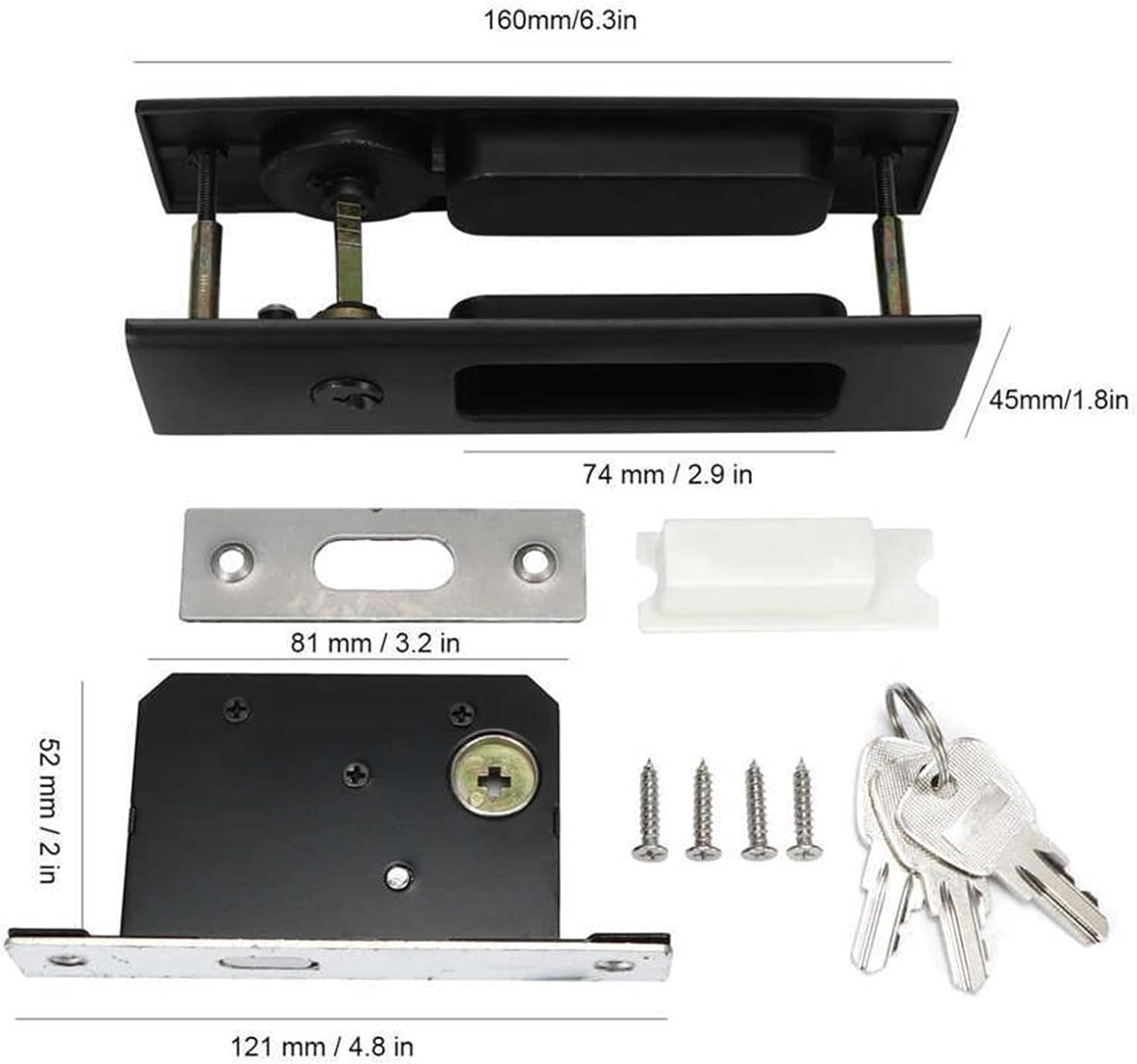 Zinc Alloy Sliding Door Lock Latch Handle Set Bathroom Balcony Cabinet Door Hardware Fittings Single Hook Sliding Door Locks 1SetMaterial: Zinc AlloyColor: Black, Brushed Silver (Optional)Weight: Approx. 582g / 20.5ozProduct Size: Approx. 160x45mm / 6.3x1.8inApplicable Door Thickness: Approx. 35-40mm/1.38-1.57inLock Body Seam Distance: Approx. 34mm / 1.3inApplication: Wooden Doors, Sliding Doors, etc.Package List:2 x Panel2 x Lock Body Screw3 x Key1 x Lock Body1 x Plastic Box1 x Door Frame Barrier Piece4 x Screw1 x English ManualNote:1.Please allow 0-1 inch error due to manual measurement. Thanks for your understanding.2.Monitors are not calibrated same, item color displayed in photos may be showing slightly different from the real object. Please take the real one as standard.